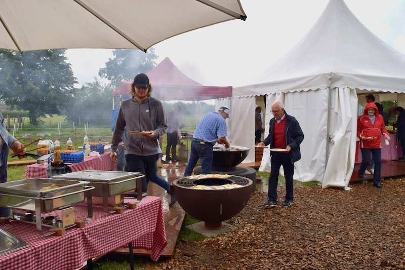 20 Helfer(innen) standen im Einsatz, und sie hatten am Morgen, bevor der Brunch losging, alle Hände voll zu tun. Wegen dem Dauerregen mussten Schnitzelwege gelegt werden, damit die Besucher(innen) nicht in der nassen Wiese anstehen mussten. Wegen Corona waren die Sitzplätze zugewiesen und angeschrieben, jeder Gast hatte seinen festen Platz.
