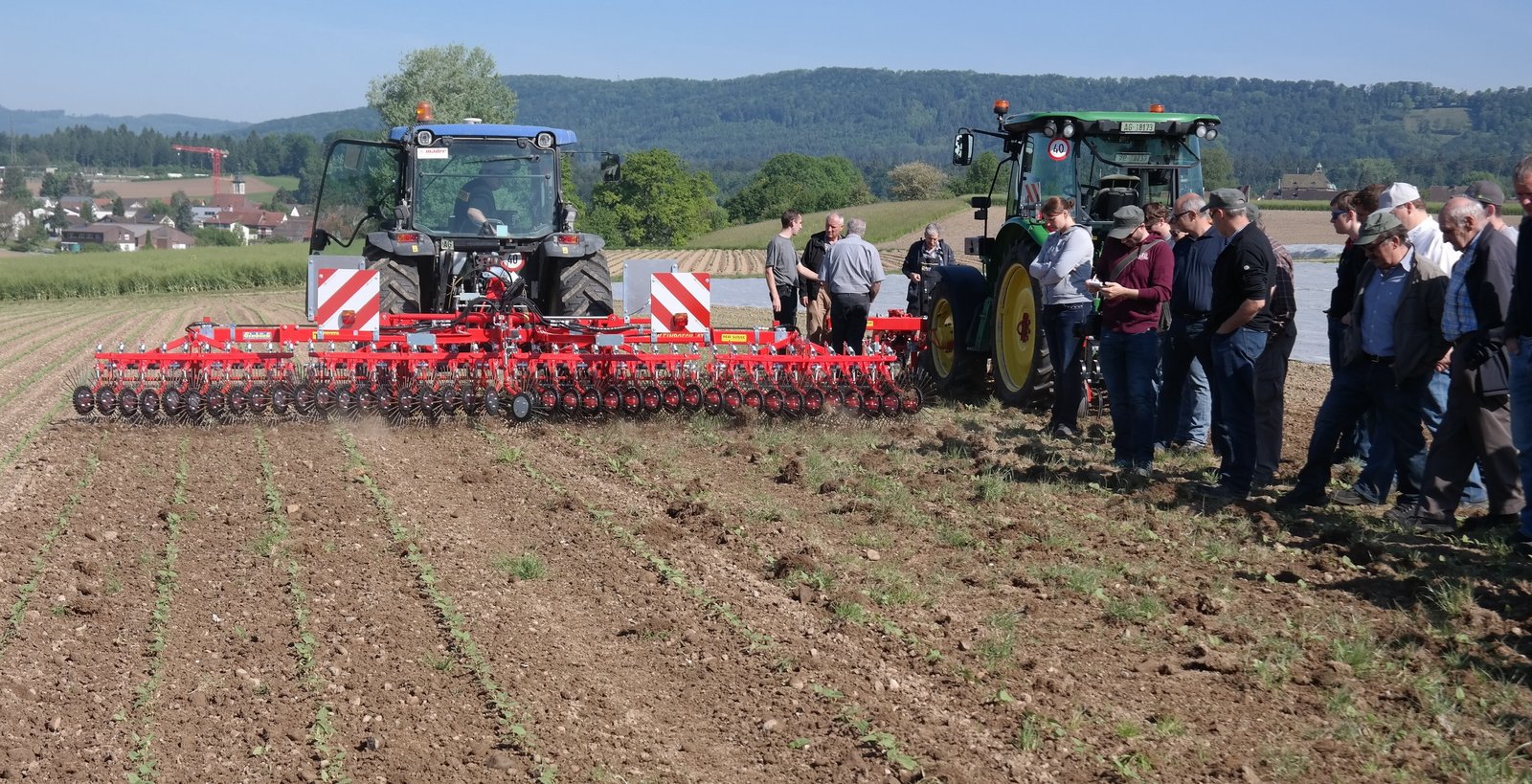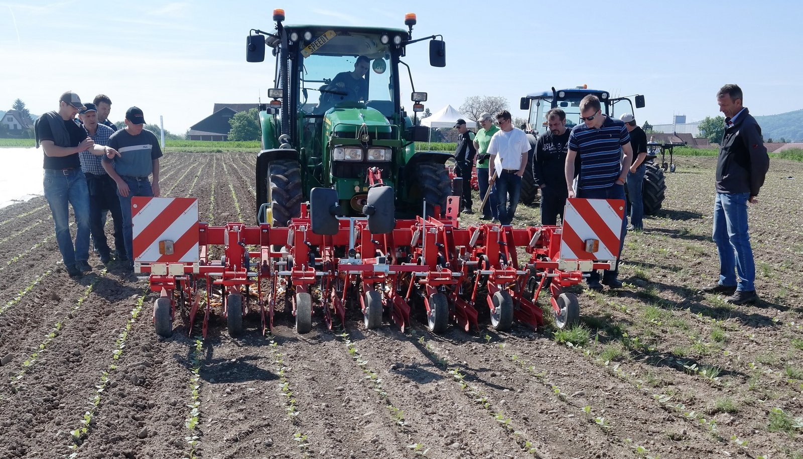 Wie mit leistungsfähigen Hackgeräten die Handarbeit vermindert und weniger Chemie nötig gemacht wird, zeigten die Demostrationen im Bohnenfeld auf dem Steinhof. Vorgeführt wurden zwei Hackgeräte von Aebi Suisse und eines von PlantCare AG. Im Bohnenfeld wurde zudem der erste Unkraut-Roboter der Schweiz, der ecoRobotix vorgeführt, der ab dem Herbst erhältlich ist. Dieser wird mit Solarenergie betrieben, arbeitet GPS-gesteuert selbstständig, kann Kulturpflanzen von Unkraut unterscheiden, benötigt im Pflanzenschutz bis zu 95 Prozent weniger Spritzmittel und kann auch zum Jäten eingesetzt werden. Die Arbeitsbreite der zwei Roboterdelta-Arme beträgt 2 m und betreut in 10 Stunden rund 3 Hektaren.