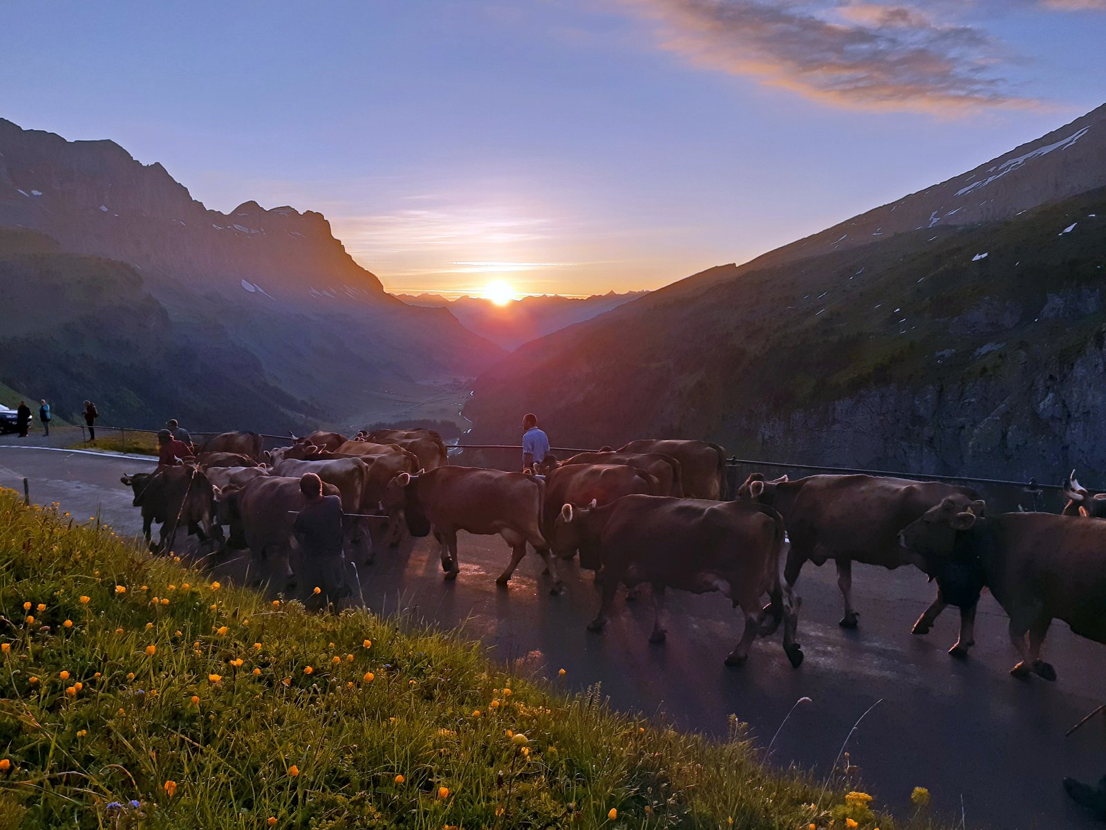 Also am Samstag 30. Mai 2020 bei Tagesanbruch noch bei heiterem Himmel setzten sich die ersten Sennten Richtung Klausenpass in Bewegung. Die meisten Kühe trugen eine «Fahrtreichel oder Bisse», was sich in einem mystischen Sound wiederhallend von den Felswänden äusserte.