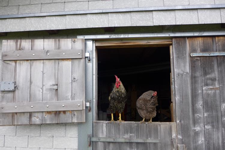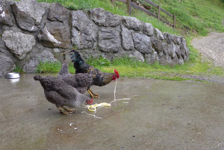 Wir haben es hier sehr schön bei den Zweibeinern. Wir wissen zwar nicht so genau warum wir hier sind, aber mal lieber nicht nachgefragt. Hier können wir den ganzen Tag draußen herum laufen und tun und lassen was wir wollen. Nur manchmal wenn wir zu neugierig sind, auf dem Tisch nach Nahrung suchen oder in die Behausung der Zweibeiner wollen, werden wir davon gejagt. Aber das hält einen so stattlichen Hahn wie mich nicht ab, es immer wieder zu probieren. Manchmal kommt auch so ein felliges, vierbeiniges Tier angejagt um uns zu verscheuchen. Ihn mögen wir überhaupt nicht. Dann schimpfen wir laut und beschweren uns. Es bringt in der Regel nichts, also wenden wir uns lieber unserem Tagewerk wieder zu und suchen uns ein ruhigeres Plätzchen, am besten wo wir uns aufbaumen können, um uns von den Strapazen zu erholen.