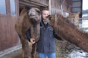 Kaum steigt Mario Koch ins Gehege seiner Kamele, trotten auch schon der 4 ¾-jährige Wallach Munir und die 1 ¾ Jahre alte Stute Naomi auf ihn zu. Immer wieder verlangen die beiden Dromedare nach ihren Streicheleinheiten, vor allem Munir. Im Stall saugt das ¾-Jahre alte Stutenfohlen an den Zitzen seiner zehnjährigen Mutter Shibam. Es geniesst die Portion Milch sichtlich. "Mit diesen Tieren ging für mich ein Herzenswunsch in Erfüllung, den ich seit meiner Kindheit habe", erzählt Mario Koch. "Schon damals war für mich klar, dass ich einmal Kamele halten möchte." Damit ist er schweizweit einer der ersten, die dieses Ziel verfolgen.