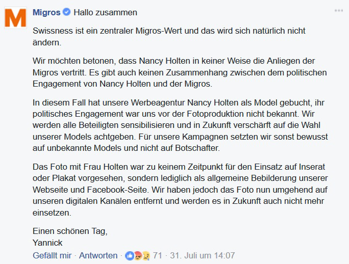 Der Schaden war aber bereits angerichtet, kaum jemand wollte glauben, dass der Grossverteiler Frau Holten ohne Wissen um ihre Aktivitäten gebucht hatte. Drum merke, liebe Migros: einem geschauten Gaul schaue nicht ins Maul, einem Model in den Lebenslauf dagegen schon.