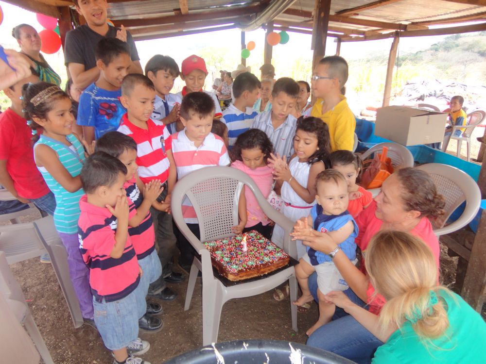 Wir führten das Fest auf unserer Finca durch, damit die Gäste unser Projekt kennen lernen konnten. Wir luden Familienmitglieder und Freunde von Jaime und mir ein. In einer solchen Gruppe sind dann auch immer viele Kinder dabei. Eine Bekannte von Jaime kochte alles servierbereit bei sich zu Hause. In grossen Pfannen transportierte Jaime das Essen dann zur Finca. Das Menu bestand aus „chancho con yuca“ (= Maniok, darüber Schweinefleisch und Kabissalat), das mit einem Becher Fanta oder Cola (darf nicht fehlen), serviert wurde.