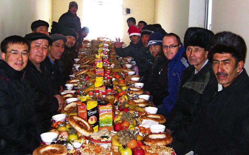Der erste Gang beim Festessen bestand aus einer heissen Suppe. Danach gab es für jeden Mitarbeiter drei besondere Stücke Schaffleisch, nämlich Leber, eine Rippe mit Fleisch und Fett vom Hintern des Schafs. Hier gibt es nämlich fast ausschliesslich Fettschwanzschafe. Diese drei Stücke haben einen besonderen Namen und gelten als Segen. Danach wurde auch der Rest des Schafs noch verteilt. Für zirka 40 Mitarbeiter wurden zwei Schafe geschlachtet.