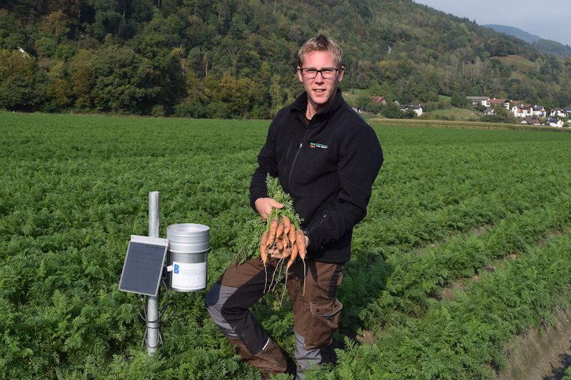 «Bodensonden sind ein Hilfsinstrument für die menschlichen Sinnesorgane», sagt René Gabathuler vom Gemüseverarbeitungsbetrieb Müller Azmoos AG in Wartau. Er steht in einem Karottenfeld. Die Kultur präsentiert sich schön: Die Reihen sind geschlossen, das Kraut ist üppig und grün, die Karotten schon bald erntereif. Vor ihm ragt eine Bodensonde einen halben Meter aus dem Boden. Dieses Jahr habe man an diesem Standort nur minim Wasser eingespart, sagt er. «Aber wir haben beim Bewässern die Wassermenge optimaler verteilt.»