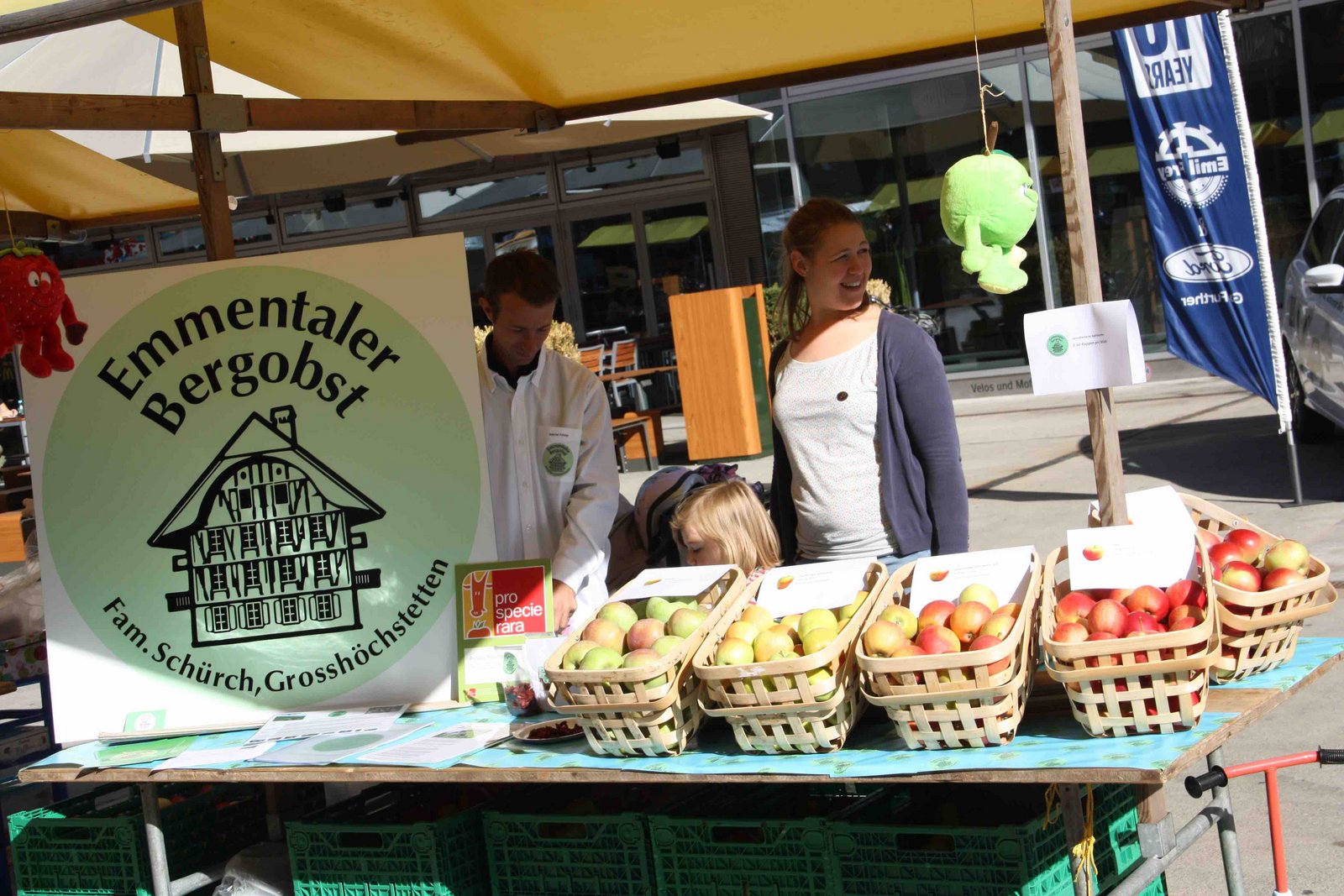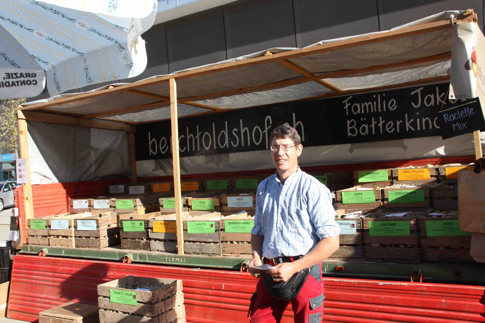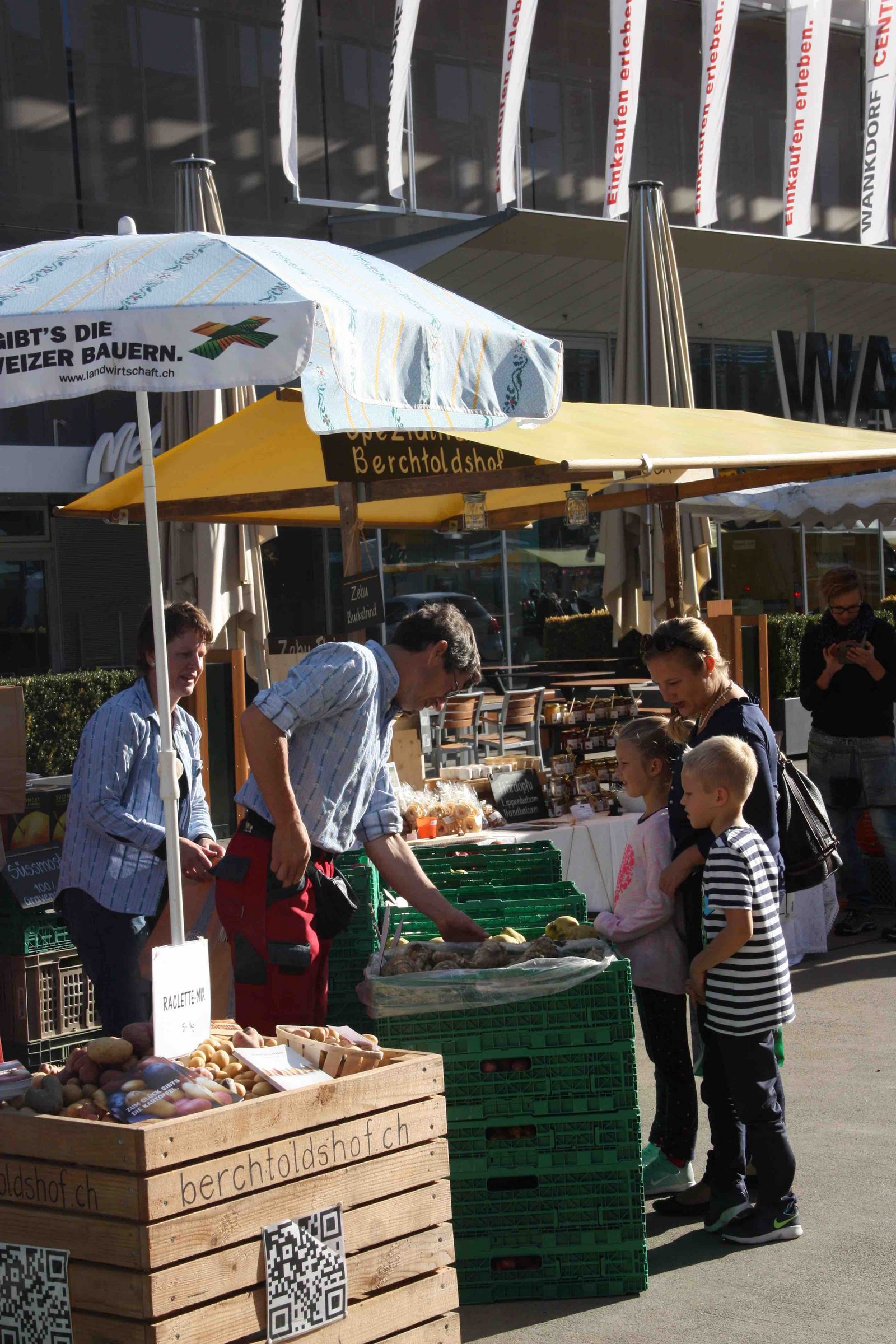 Das Marktgeschehen ist in vollem Gange. Heute Freitag und morgen Samstag findet der Öpfu- und Härdöpfu-Märit auf dem Quartierplatz vor dem Wankdorf-Center in Bern, bereits zum achten mal statt. Doch wer nun denkt, auf dem Markt gebe es unzählige Stände, an denen die tollen Knollen und die meistgegessene Frucht der Schweiz gekauft werden können, der irrt. Zwar gibt es vor Ort frisch gepressten Apfelsaft, Apfelkuchen, Apfel-Chüechli mit Vanillesauce oder auch Rösti und Chips, aber Kartoffel- und Obstproduzent ist jeweils nur einer vor Ort. Daneben werden an rund 40 Ständen weitere Produkte wie Honig, Sauerkraut, Käse, diverse Tee- und Sirupsorten, sowie Handarbeiten und peruanische Spezialitäten angeboten. Letzteres, da Peru zu den Ursprungsländern der Kartoffel gehört.