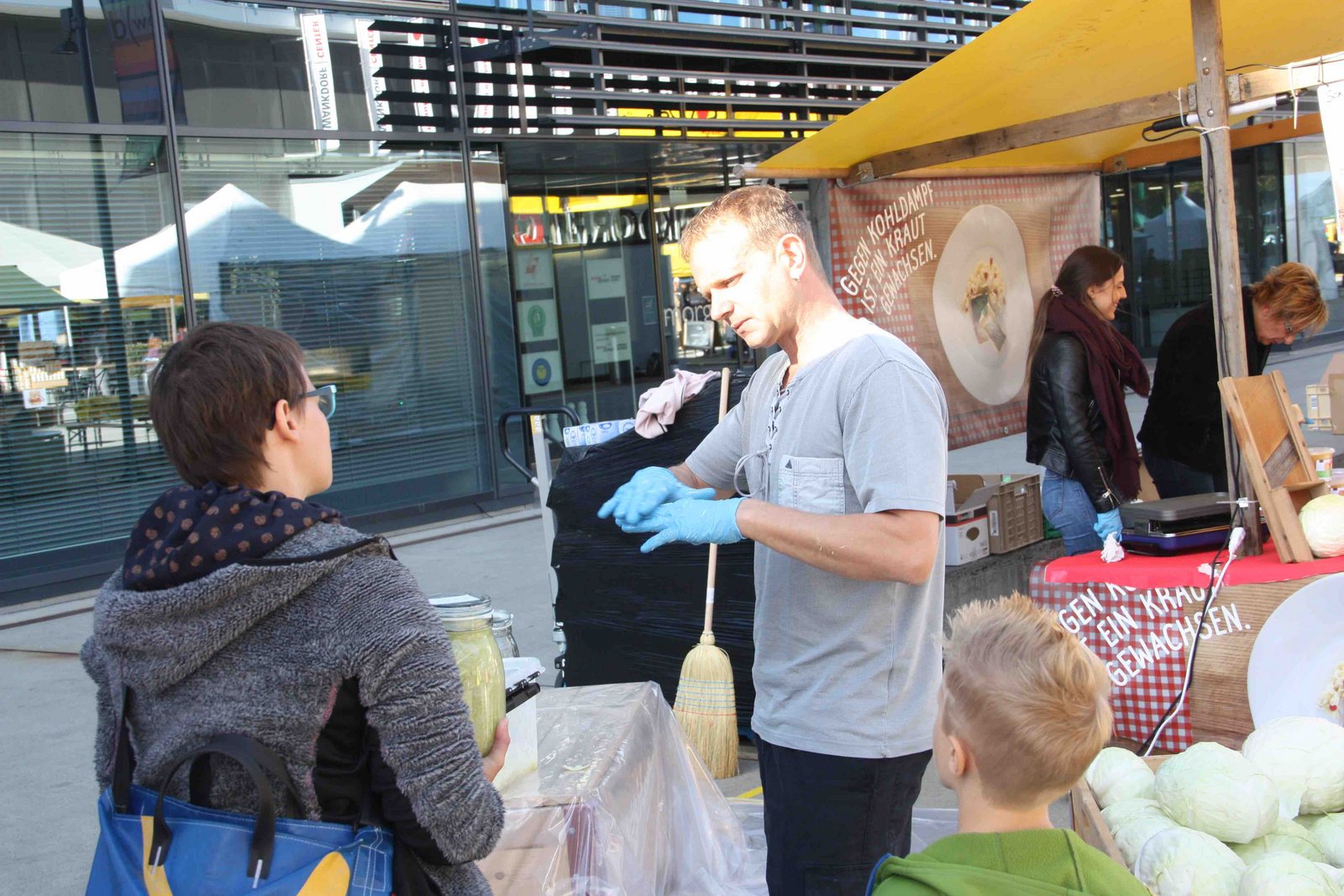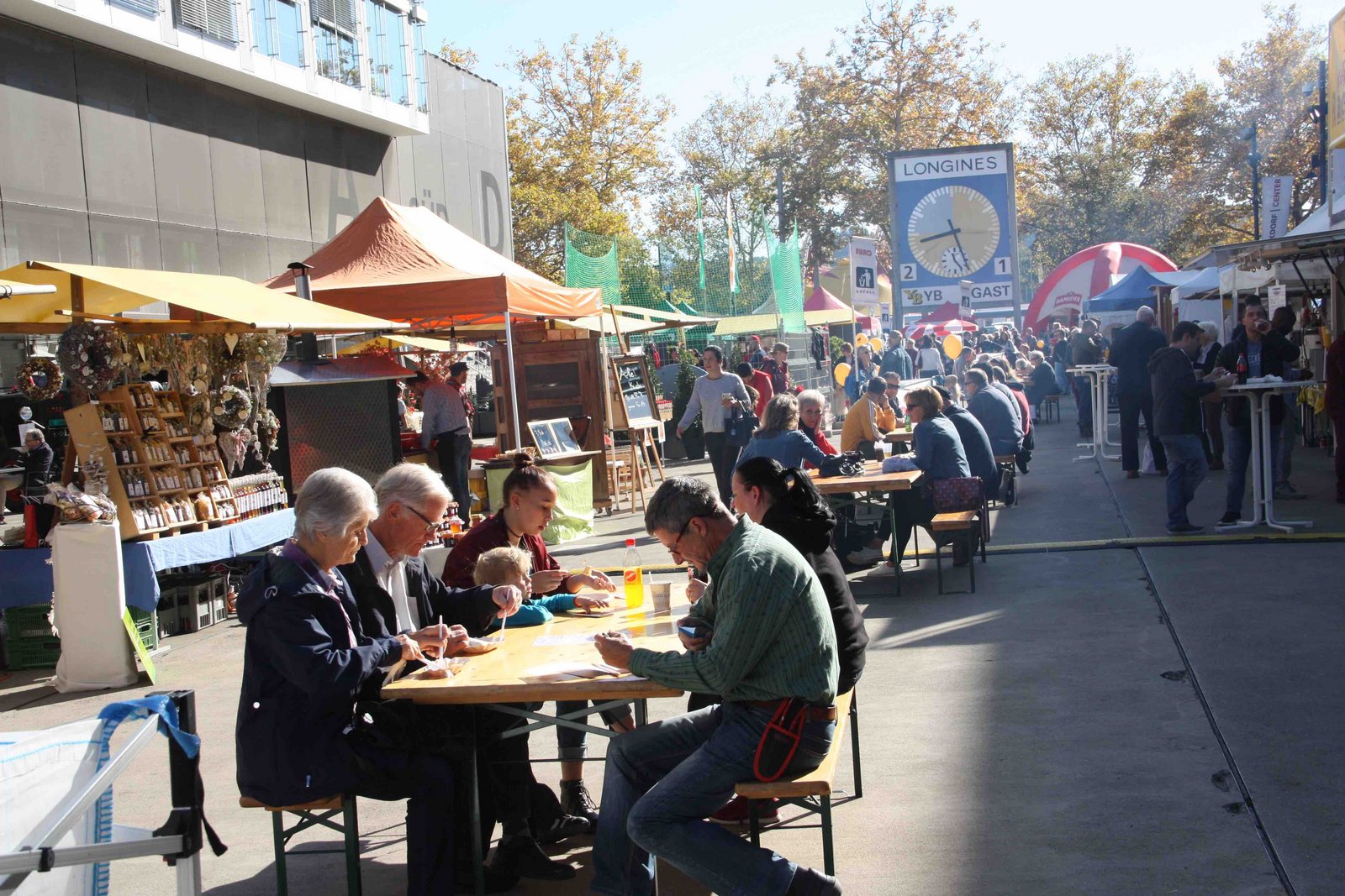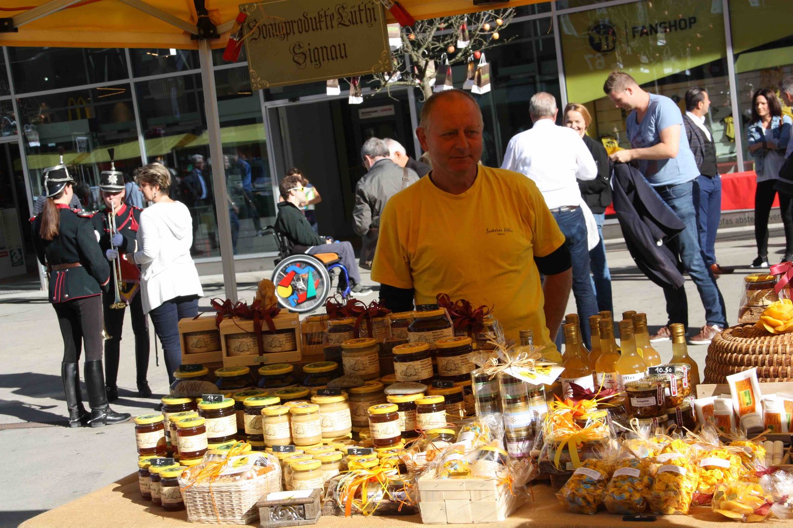 Das Marktgeschehen ist in vollem Gange. Heute Freitag und morgen Samstag findet der Öpfu- und Härdöpfu-Märit auf dem Quartierplatz vor dem Wankdorf-Center in Bern, bereits zum achten mal statt. Doch wer nun denkt, auf dem Markt gebe es unzählige Stände, an denen die tollen Knollen und die meistgegessene Frucht der Schweiz gekauft werden können, der irrt. Zwar gibt es vor Ort frisch gepressten Apfelsaft, Apfelkuchen, Apfel-Chüechli mit Vanillesauce oder auch Rösti und Chips, aber Kartoffel- und Obstproduzent ist jeweils nur einer vor Ort. Daneben werden an rund 40 Ständen weitere Produkte wie Honig, Sauerkraut, Käse, diverse Tee- und Sirupsorten, sowie Handarbeiten und peruanische Spezialitäten angeboten. Letzteres, da Peru zu den Ursprungsländern der Kartoffel gehört.
