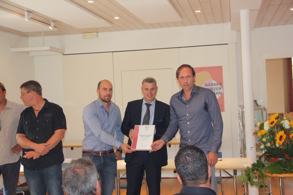Heute Vormittag herrschte Spannung im Haus des Bielerseeweins in Twann. Volkswirtschaftsdirektor Christoph Ammann verlieh die Preise des jährlichen Wettbewerbs Berner Wein des Jahres sowie Berner Winzer(in) des Jahres. Letzteren Titel holten sich die Brüder Gabriel und Silvan Andrey aus Ligerz. Sie führen den Familienbetrieb Andrey Wein bereits in fünfter Generation. Zwar obliegt die Geschäftsführung in den Händen der Brüder, doch die Eltern tragen immer noch wichtige Verantwortung im Familienbetrieb, verrät Gabriel Andrey der BauernZeitung.