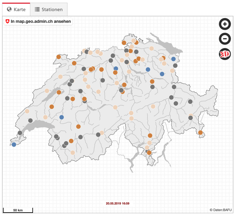 Die hydrologische Karte des Bundesamts für Umwelt zum aktuellen Grundwasserspiegel verschiedener Messstationen in der ganzen Schweiz zeigt grosse Unterschiede. So liegen an manchen Stationen die Pegel deutlich höher dem langjährigen örtlichen Mittel (im Kanton Genf, Freiburg, Aargau, St. Gallen und Appenzell-Innerrhoden). Andernorts (Kanton Bern, Tessin, Solothurn) sind die Pegel weiterhin unterdurchschnittlich, oder liegen in der Norm. Die Karte präsentiert sich sehr heterogen, regionale Unterschiede sind also gross und es lässt sich kein deutliches Muster erkennen.