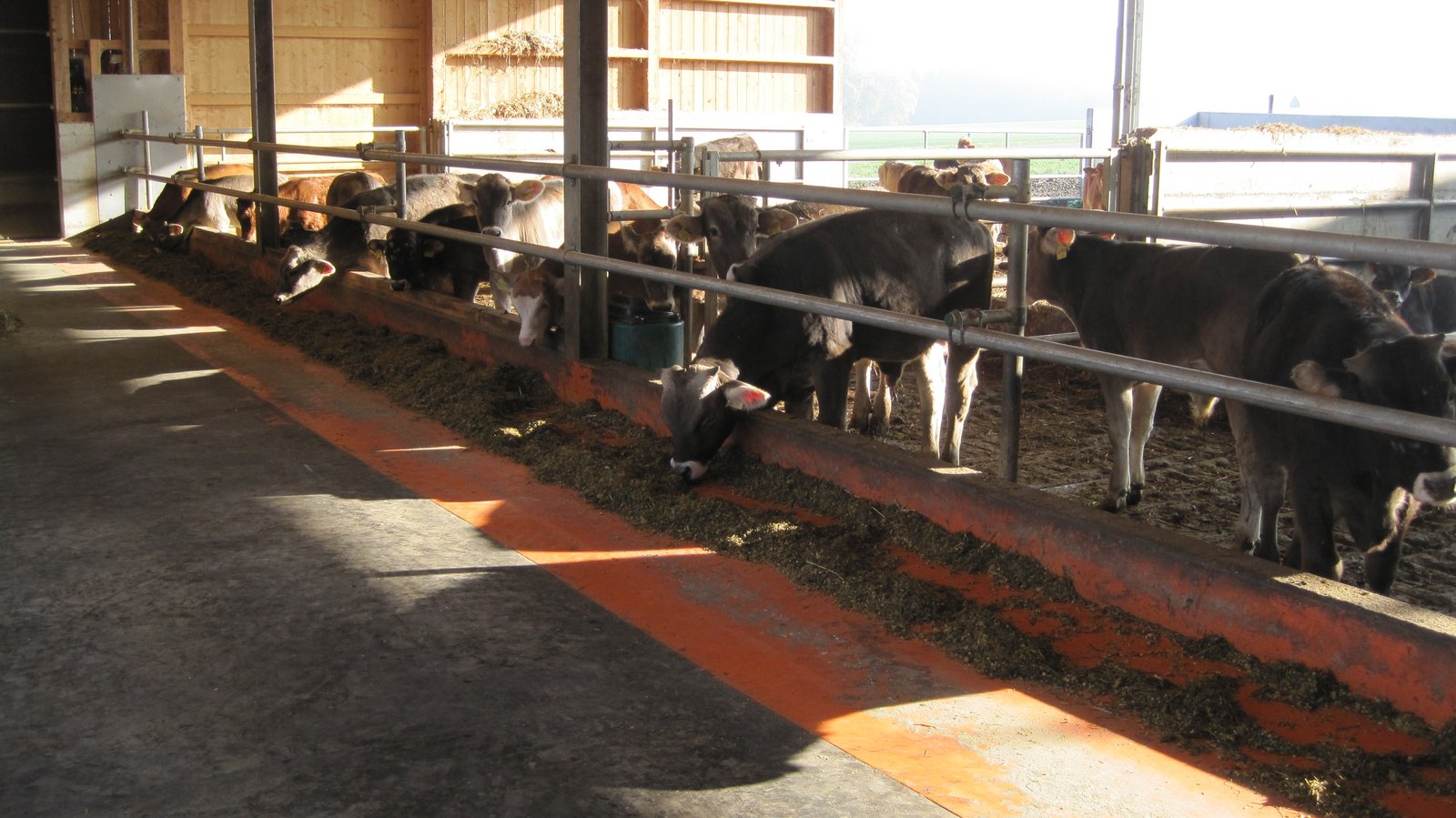 Annemarie und Andreas Widmer-Stirnimann aus Eschenbach haben vor kurzem ihren Rindviehmaststall erweitert. Der neue Offenfrontstall mit Spaltenboden im Fress- und Auslaufbereich und Tiefstroh im Liegebereich ist für 106 Masttiere ausgelegt. Das Stroh wird im Liegebereich einmal täglich mit einer Einstreumaschine verteilt. Bei einem Ausbau des Milchviehstalles könnte eine neue Futterachse gut in das bestehende Baukonzept integriert werden.
