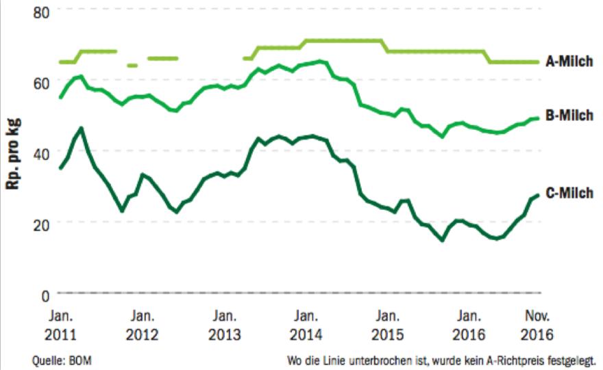 der Branchenorganisation Milch (BOM) zusammengetreten, um dieses Traktandum zu diskutieren. Entschieden wurde, wie bereits im Voraus erwartet: Der Richtpreis für A-Milch bleibt für das erste Quartal 2017 mit 65 Rappen je Kilo stabil.