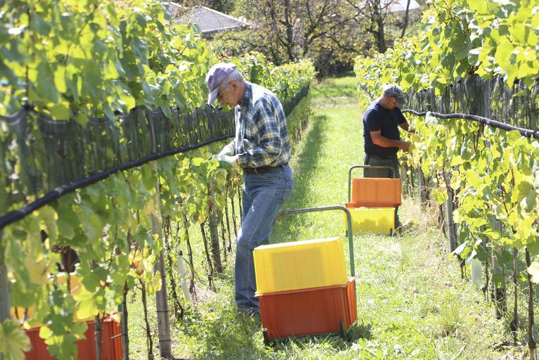 Baumgartners setzen seit vielen Jahren auf das beherzte Engagement von Erntehelfern. "Heute haben wir zwei neue dabei. Unsere Equipe baut sich fortlaufend wieder auf", erläutert Baumgartner. "Wir rekrutieren aus unserem Kreis von Verwandten und Kollegen. Aber vor allem sind viele unserer Kunden beste Freunde geworden, auf die wir zählen dürfen." Die temporären Erntehelfer werden nach Anzahl Stunden entlöhnt. Ausbezahlt werden sie in Naturalien in Form von Weinflaschen, die sie aus dem Sortiment des Familienbetriebs auswählen.