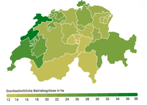 Schweizweit beträgt die durchschnittliche Betriebsgrösse 20 ha. 10'684 Betriebe: Kein Kanton hat mehr Bauernhöfe als Bern. Quelle ist das Bundesamt für Landwirtschaft. Die Zahlen beziehen sich auf das Jahr 2016.