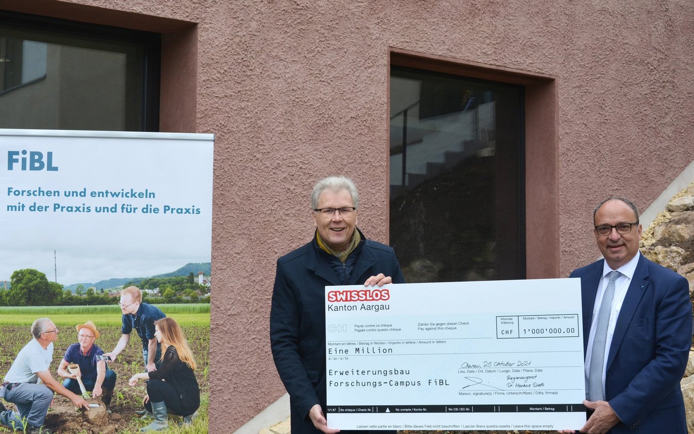 Gestern wurde die letzte Million durch Regierungsrat und Landwirtschaftsdirektor Markus Dieth überreicht. «Dank dem Ausbau des Forschungs-Campus wird das FiBL aufgewertet und es werden wichtige Weichen für die Zukunft gestellt. Ich freue mich riesig, dass wir mit dem FiBL einen wichtigen Player in der Bio- und Nachhaltigkeitsforschung im Kanton Aargau haben und mit dem Ausbau über 50 neue Arbeitsstellen geschaffen werden», sagte er anlässlich der Übergabe.