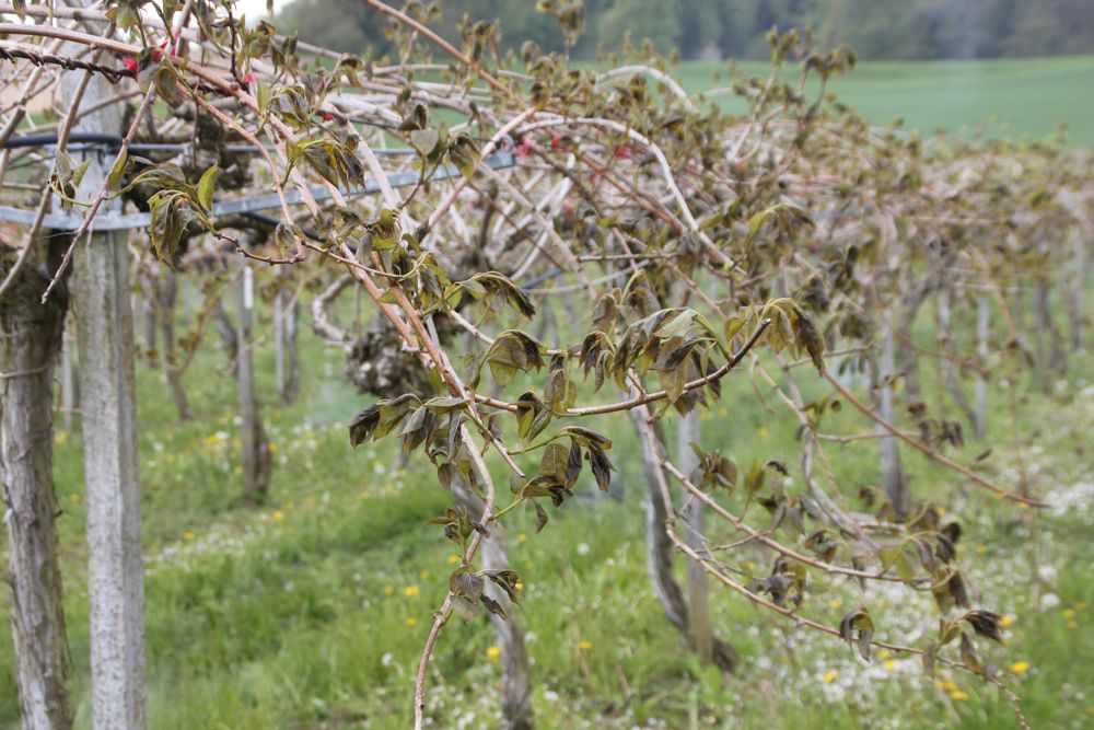 Am Donnerstag um die die Mittagszeit zeigte sich ein teilweise beachtliches Schadensbild. Im Weinbau fällt dieses unterschiedlich aus. Je nach Sorte, Unterlage, Lage und Wachstumsstand sind erste sichtbare Schäden vorhanden, wobei man sicher mit positiven und negativen Überraschungen rechnen muss. Eine Schadensminderung dürfen jene Rebbauern erwarten, welche präventiv auf das Anschneiden einer Frostrute gesetzt haben. Arg sieht es auch in der Minikiwianlage in Truttikon aus. Trotz dem enormen Einsatz mit den vielen Feuern konnte David Keller und seine Helfer nicht verhindern, dass ein Grossteil der jungen Triebe sich bräunlich bis schwarz einfärben und absterben. Beim Obst allgemein wird es sich erst zeigen müssen, wie sich die kalte Nacht ausgewirkt hat.