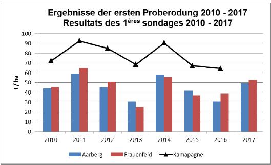 Nach einem trockenen und - mit Ausnahme vom Januar - milden Winter, konnten die Rüben in der zweiten Märzhälfte bei sehr guten Bedingungen ausgesät werden. Aussergewöhnlich hohe Bodentem-peraturen ermöglichten ein rasches Auflaufen, aufgrund der beginnenden Trockenheit jedoch teilweise Stufenweise. Bis Ostern hatten die Rüben einen deutlichen Vegetationsvorsprung. Durch einen Kälteeinbruch mit mehreren Frostnächten und Schneefällen bis in tiefe Lagen stellten sie jedoch das Wachs-tum vorübergehend ein. Zudem mussten einige Parzellen umgebrochen werden. Bei den ersten Parzellen konnte der Reihenschluss Ende Mai beobachtet werden, was dem Durchschnitt der letzten Jahre entspricht.