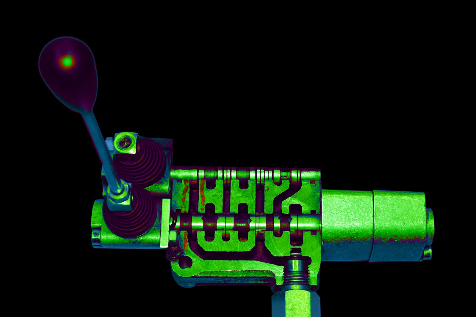 Ein elektrisch betätigtes Zusatzhydraulikventil hat das gleiche Schiebestück. Die Ansteuerung erfolgt jedoch elektrisch, indem das Schiebestück mit einem über das Gehäuse gesteckten Magnet herangezogen wird. Je