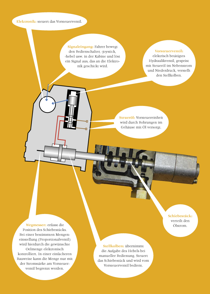 direktbetätigtem Ventil durch den Stromverbrauch begrenzt. Ein Traktor schöpft jedoch wesentlich mehr Öl pro Minute und ist deshalb mit anderen Ventilen bestückt. Hier kommen elektrisch betätigte Zusatzhydraulikventile mit einem so genannten Vorsteuer-