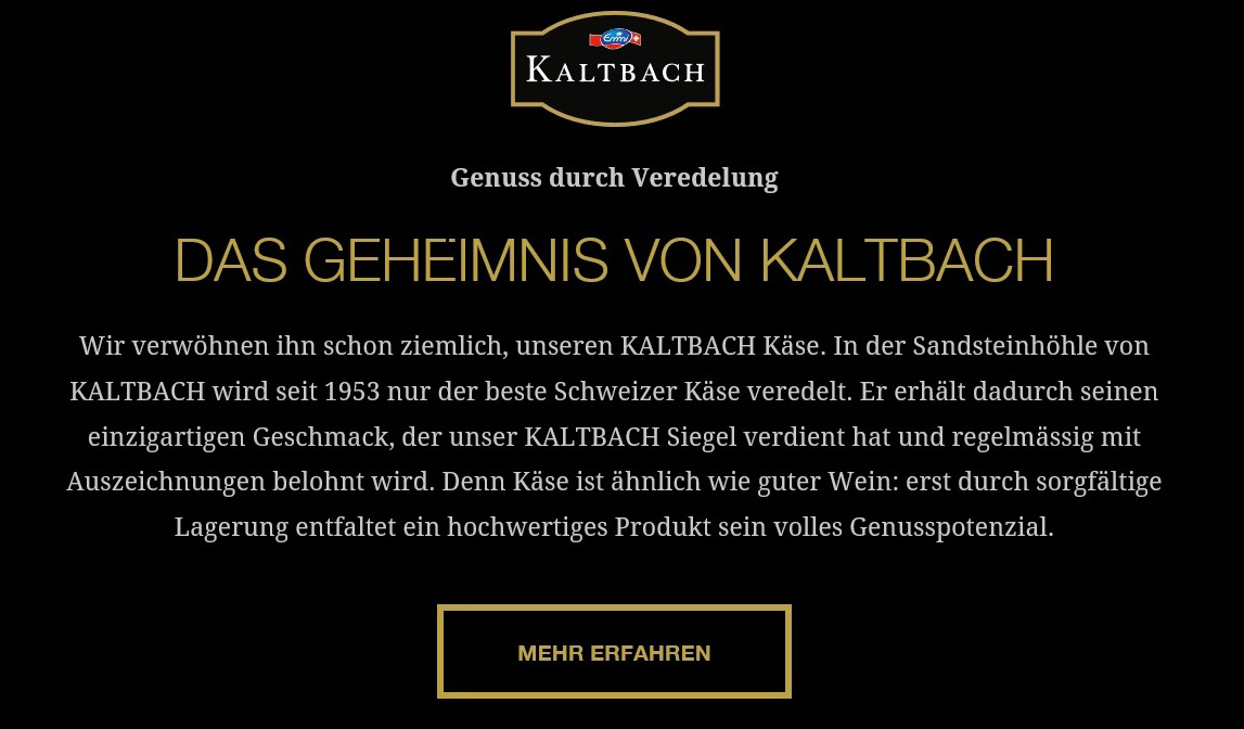 Emmi erklärt auf Anfrage, die Positionierung der Marke Kaltbach sei insbesondere im Ausland, wo zwei Drittel dieser Käse abgesetzt werden, nicht auf Swissness ausgerichtet. Unterdessen hat man das auch auf der Kaltbach-Website umgesetzt. Dort wo vorher stand, dass «nur der beste Schweizer Käse» in die Höhle kommt, ist jetzt nur noch von «der beste Käse» die Rede. «Auf der Website wurde die Weiterentwicklung des Kaltbach-Sortiments leider nicht konsequent nachvollzogen», erklärt das Unternehmen dazu.