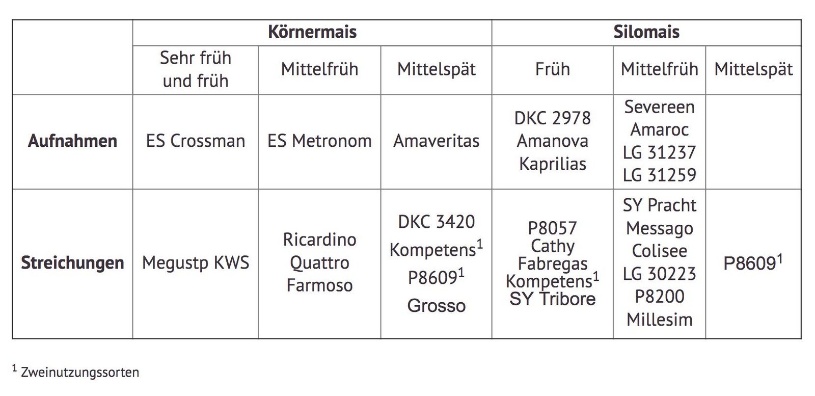 Für 2018 wurden zehn neue Sorten auf der Liste der empfohlenen Sorten von swiss granum aufgenommen, darunter sieben Silo- und drei Körnermaissorten. Achtzehn Sorten wurden von der Liste gestrichen, darunter zehn Silo-, sechs Körnermaissorten und zwei Zweinutzungssorten.