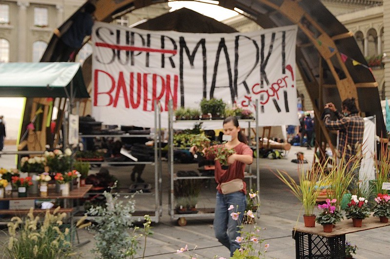 Bauernmarkt ist super, Detailhandel nicht, so lautet hier die Botschaft. (Bild riseupforchange.ch)
