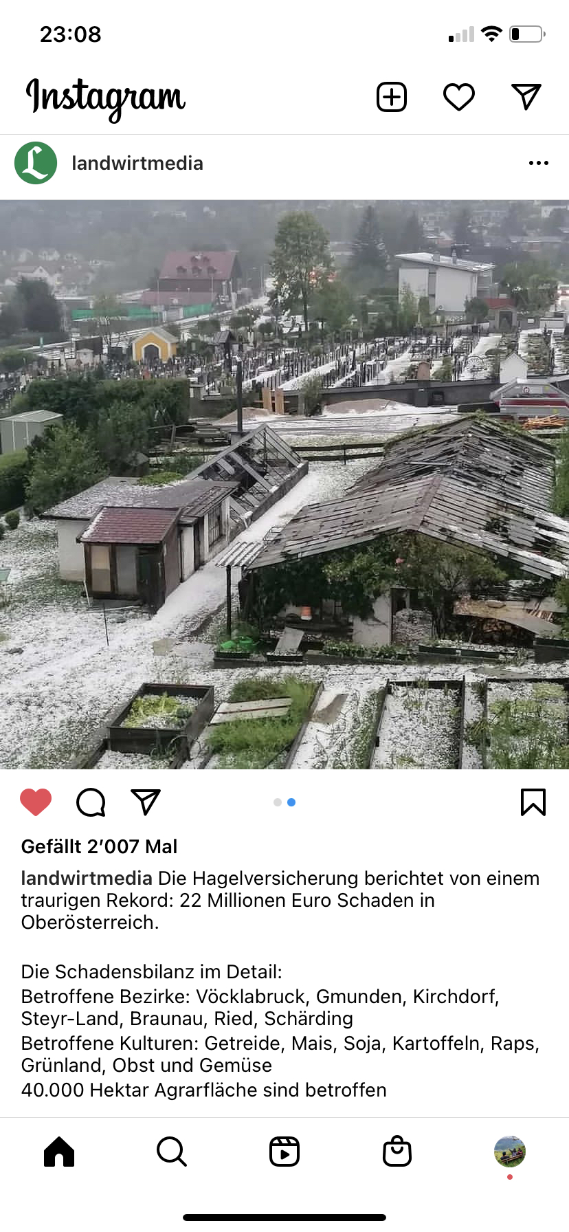 Laut Berichten auf den Sozialen Medien (siehe links) schätzt die Hagelversicherung in Oberösterreich die dortigen Schäden in der Landwirtschaft auf 22 Millionen Euro – ein trauriger Rekord. 40'000 Hektaren Kulturland seien betroffen.