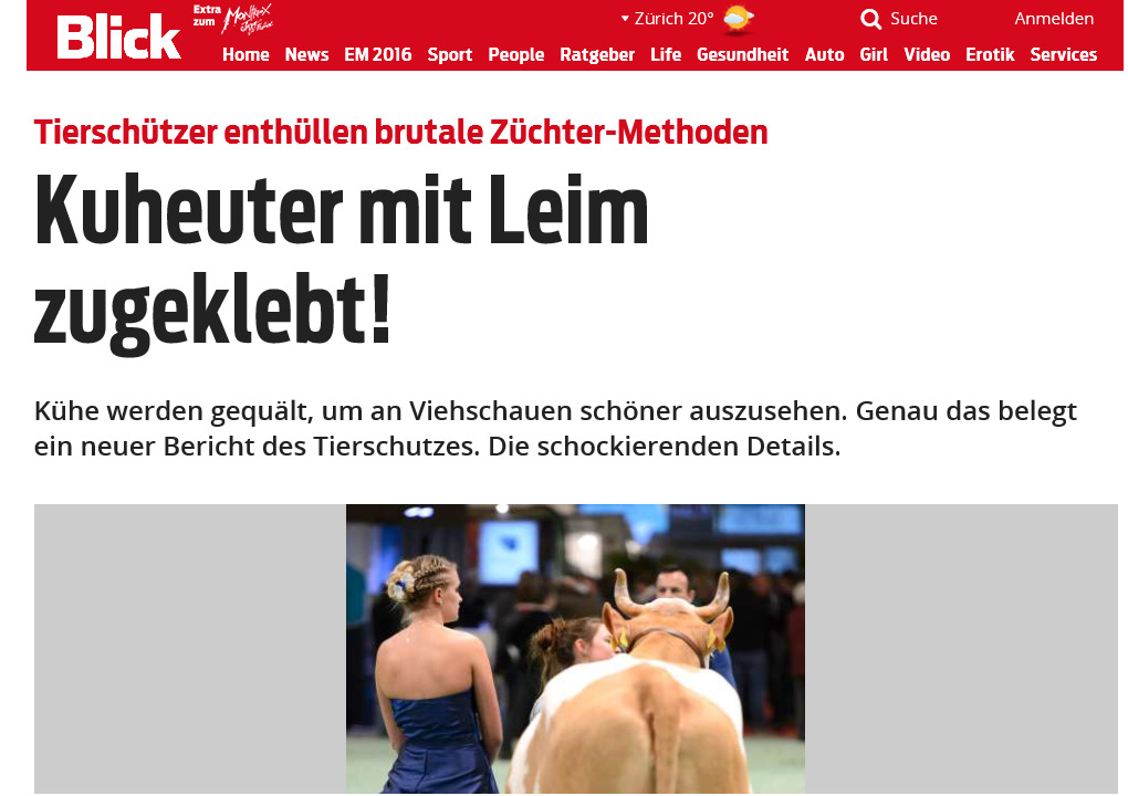 Auch der "Blick" liess es sich nicht nehmen, in seiner Online-Ausgabe auf das Thema einzugehen. "Tierschützer enthüllen brutale Züchter-MethodenKuheuter mit Leim zugeklebt!", lautet der Titel der Geschichte, darunter finden sich mehrere Dutzend Kommentare, welche die Praktiken mehrheitlich scharf kritisieren.