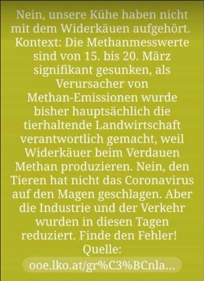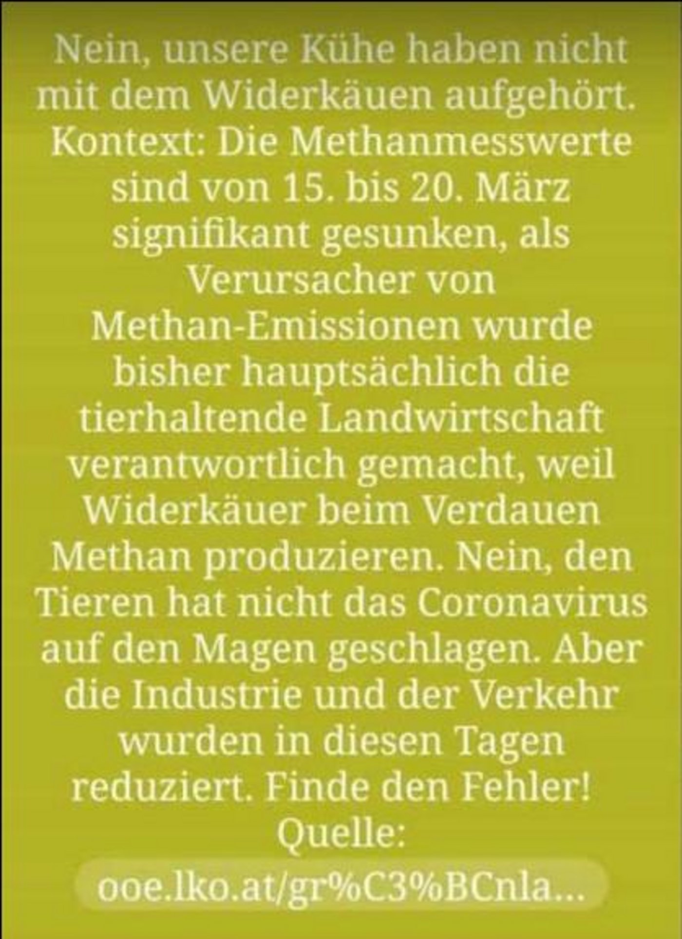 Die Methan-Konzentration in der Luft sei vom 15. bis 20. März 2020 signifikant gesunken, heisst es in einem Text, das kürzlich auch in Landwirtschaftskreisen die Runde machte: