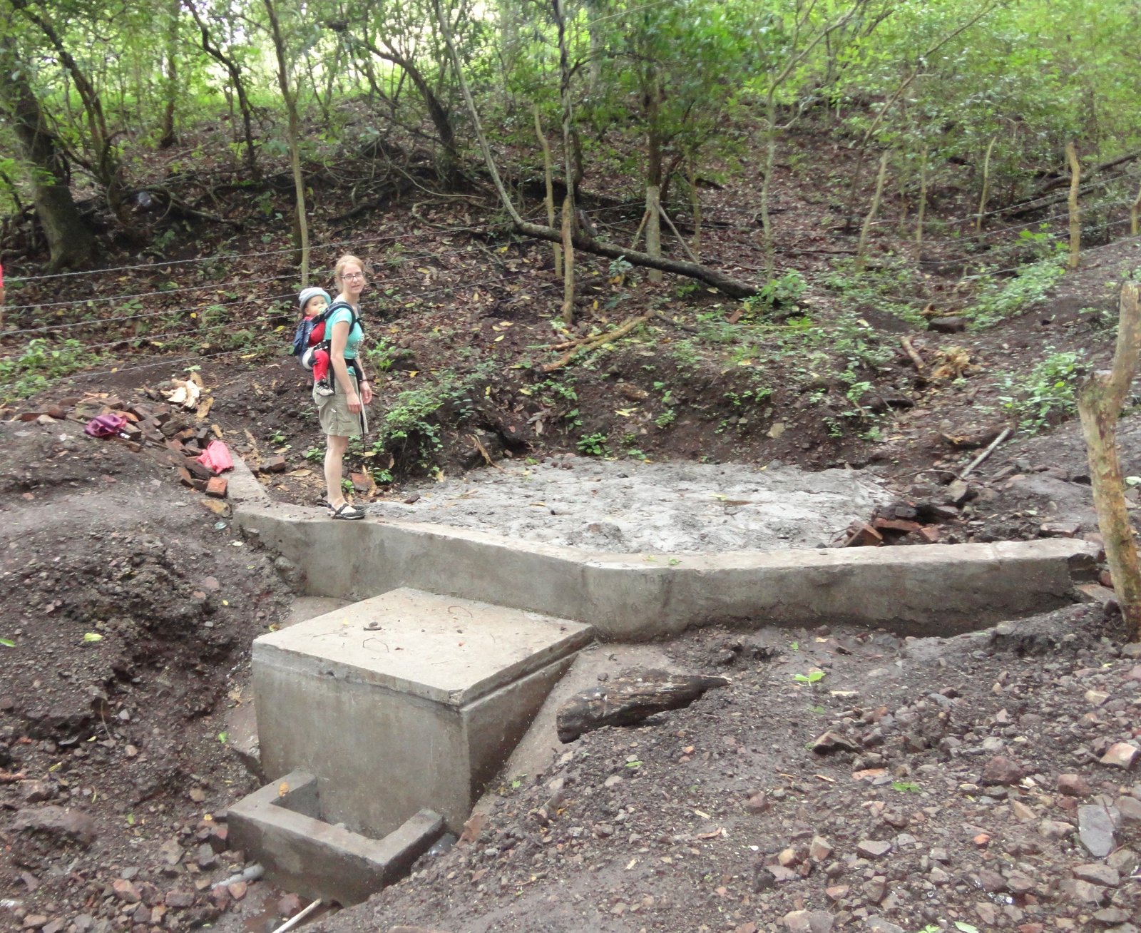 Die obere Wasserquelle, welche wir in einem ersten Schritt gefasst haben, befindet sich ca. 30 min Fussmarsch vom Wohnhaus entfernt, in einem kleinen Tälchen im Wald (Foto). Vorher floss dieses Wasser als kleines Bächlein in den Fluss „Calico“, welcher das Dorf San Dionisio durchquert. Die Kühe hatten über die ganze Strecke Zugang zu diesem Trinkwasser. Nun wurde die Quelle mit einem Tank geschützt. Aus diesem Tank gelangt das Wasser direkt über eine eineinhalb Kilometer lange Wasserleitung bis zum Sammeltank. Dazu haben 7 bis zeitweise 20 Arbeiter während Wochen einen 80 cm tiefen Graben geschaufelt. Da die Beschaffung von so vieler Werkzeuge, wie Schaufeln und Pickel, eine kostspielige Sache ist, hat Jaime ein neues System erfunden. Er zahlte einem Arbeiter eine gewisse Summe zusätzlich zu seinem Tageslohn, wenn er sein eigenes Werkzeug mitnahm. Diese Mehrverdienstmöglichkeit führte dazu, dass alle versuchten, ein Werkzeug bei Familie, Nachbarn oder Freunden zu organisieren. So waren immer genügend Werkzeuge vorhanden und die Arbeiten kamen dadurch zügig voran. Rechtzeitig, nämlich bevor die Regenzeit einsetzte, musste das Verlegen der Rohre beendet sein, damit der Graben nicht fortwährend wieder zugeschüttet wurde.