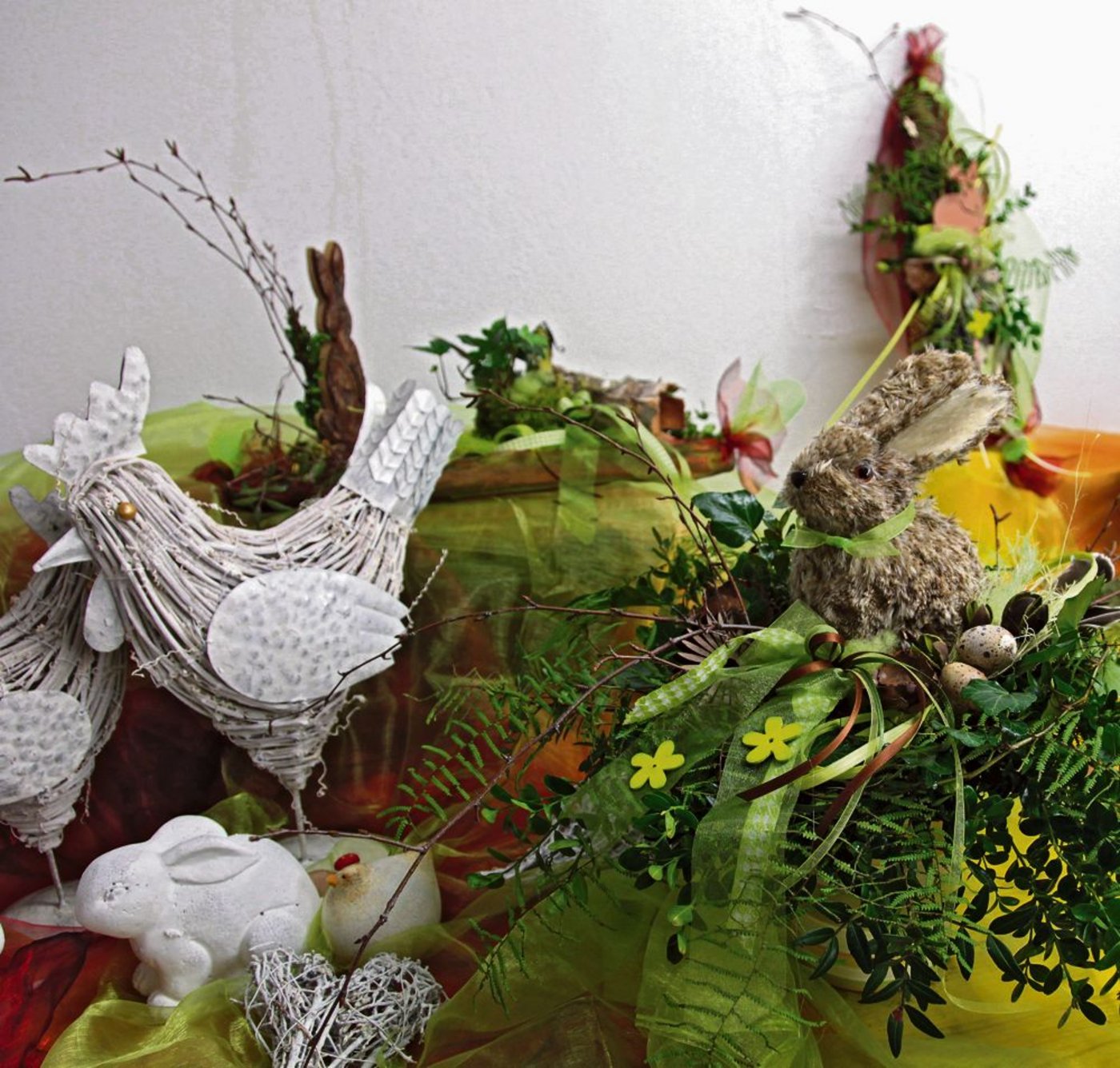 «Wow!», denkt wohl jeder, der ins kleine Atelier von Sibylle Kläger tritt. Die Gestecke, Frühlingskränze und Sträusse lassen das Herz jeder Blumenfreundin höher schlagen. Ostern, Frühling – leuchtendes Grün und zarte Farbtöne wohin das Auge reicht. Und dazwischen Holz- oder Blechosterhasen, kunstvoll von Sibylle Kläger bemalte Enten, Hühnerscharen.