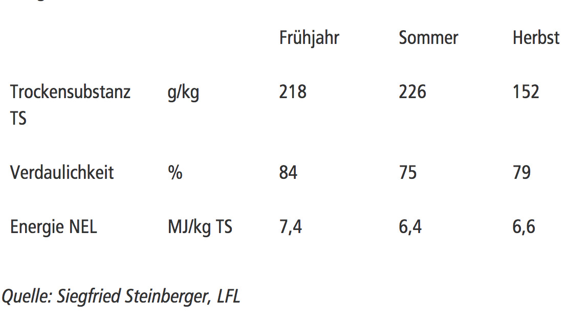 Aber auch im Lauf der Vegetationsperiode kann sich die Zusammensetzung der Ration stark verändern, z.B. wenn von altem Kleegras auf junges Naturwiesengras umgestellt wird. Wird zu schnell umgestellt fehlen im Pansen die entsprechenden Mikroorganismen und das Futter kann nicht optimal ausgenützt werden. Es kommt zu Effizienzverlusten. Mit Gras optimal zu füttern ist eine Kunst für sich.
