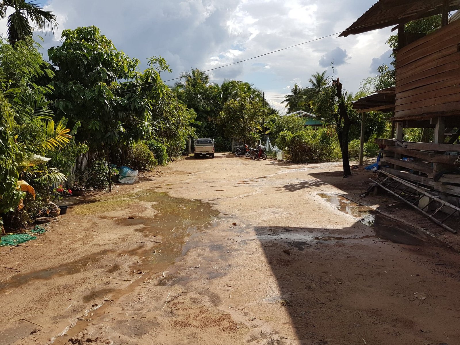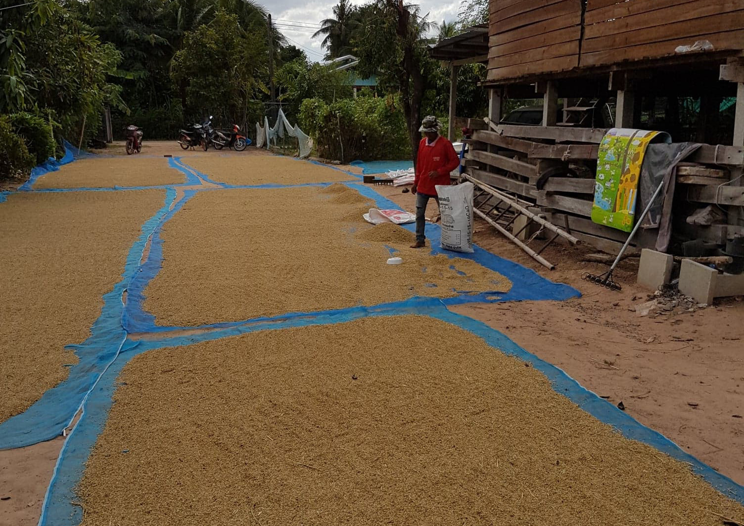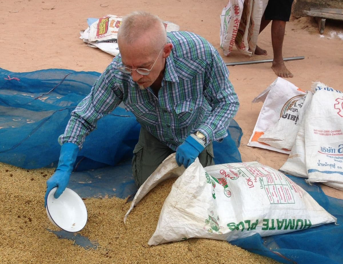 Dabei hatten sie Glück: Kurz vor einem "Rückfall in die Regenzeit" konnten sie im Dorf Rattanaburi in der Provinz "in einem Kraftakt, vier Erwachsene, eine Halbwüchsige und zwei Kids drei Tonnen gerade ungefähr genügend getrockneten Reis von Hand in Säcke abfüllen und ins auf Stelzen stehende Reislager hochstemmen".