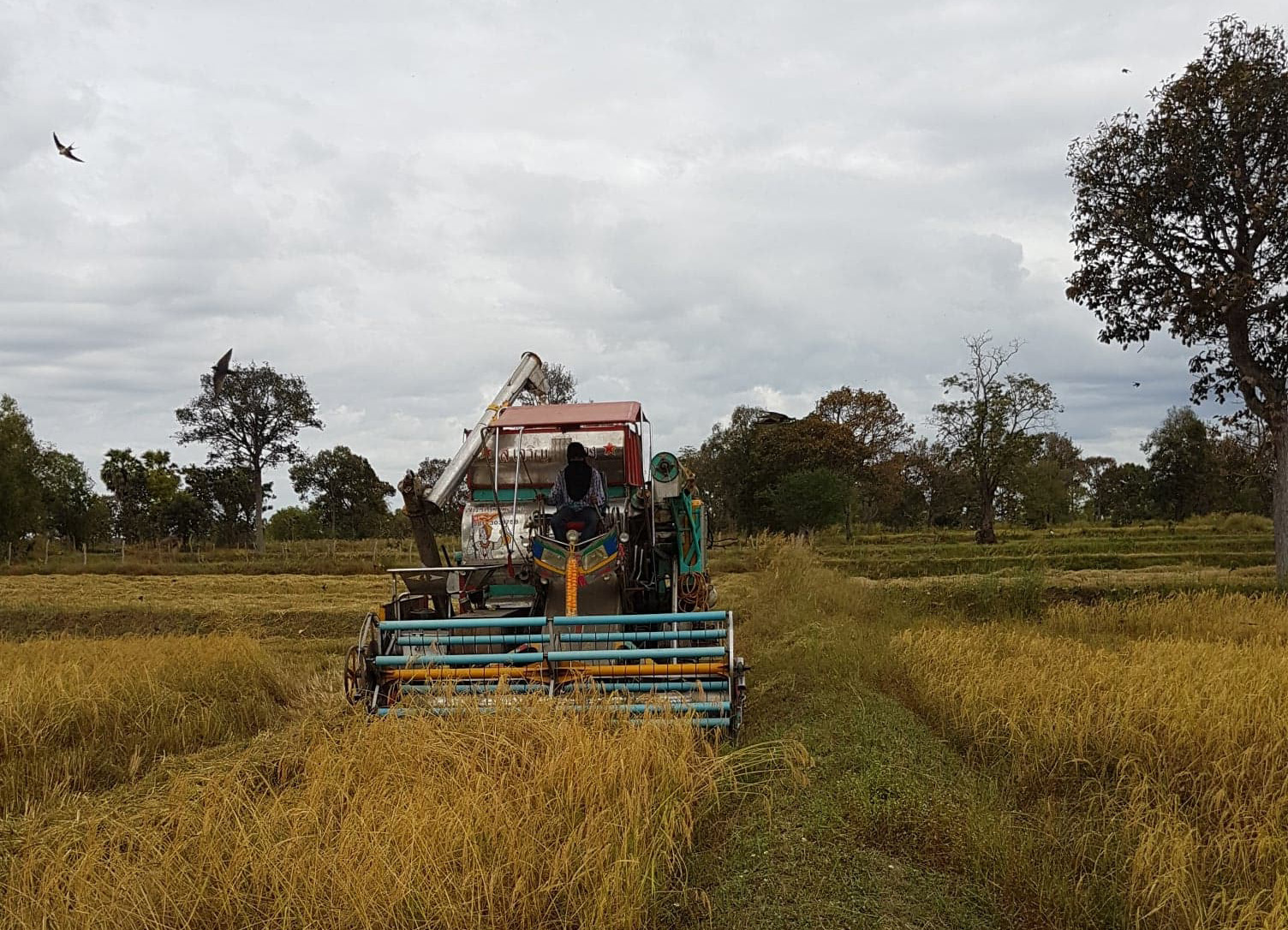 Geerntet wird mit einem Mähdrescher japanischer Provenienz. Für aufrechtstehende Halme mit der heutigen Technologie das Vorgehen mit dem minimalsten Verlust an Körnern", schreibt Morf, "vom Wind oder Regen oder wegen Halmschwäche eingedrückte Stellen ernten wir aber immer noch von Hand", so Morf. Viele im Dorf hätten weniger Glück gehabt: "Deren Reis wurde bachnass, die Körner drohen nun, im Spelz drin zu verschimmeln."