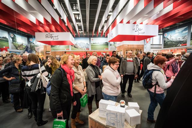Am Schweizer Stand kann man sich nicht nur sportlich betätigen, sondern auch an zwölf Marktständen schlemmen. So gibt es selbstverständlich Schweizer Käse (Appenzeller, Emmentaler, Gruyère und Tête de Moine), aber auch Schokoladen von Camille Bloch und Maestrani sowie typische Geschenkartikel (Schweizer Sackmesser, Raclette- und Fonduegeschirr) zu kaufen.