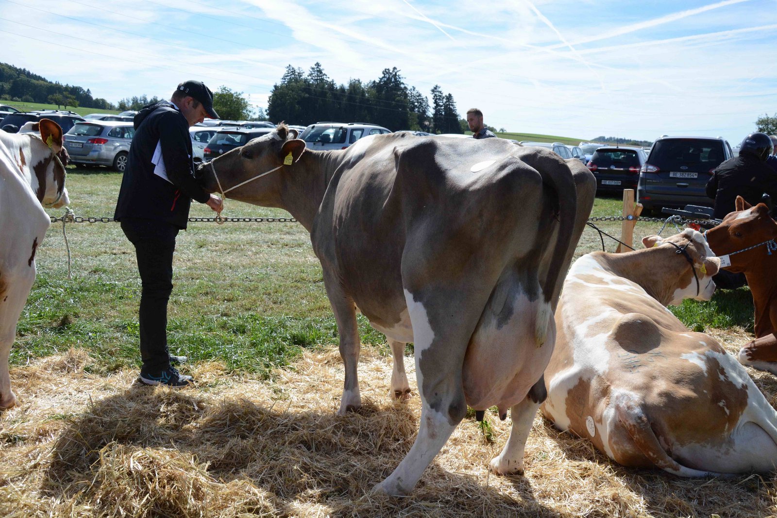 Swissherdbook-Präsident Markus Gerber war zur Stelle und verlängerte den Strick um einige Zentimeter, damit sich die müde gewordene Dame hinlegen konnte. Der grosse Kopf reichte dann durch den längeren Strick fast bis zum Gras hinunter, worauf die Kuh es sich noch einmal anders überlegte und entschied, ihre Zeit doch erst dem Fressen und dann der Erholung zu widmen. «Was willst du jetzt?», fragte sie Gerber, dem die Kuh umgehend einen selbstsicheren Blick zuwandte. Dieser dürfte mit der Aussage gleichzusetzen sein: «Hey, Swissherdbook-Präsident, mach den Strick noch etwas länger, bitte!»
