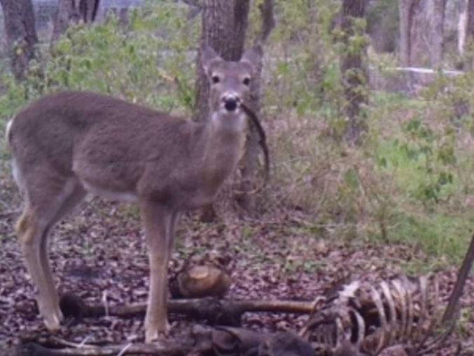 An einer Forschungsanlage der Texas State University untersuchen Wissenschaftler wie sich menschliche Körper in der freien Natur zersetzen. Mittels bewegungsempfindlicher Kameras beobachten sie dabei auch wie Tiere auf die Leichen reagieren. Das Hirsche gelegentlich auch Vögel oder Mäuse essen ist bekannt, dass sie jedoch an einem Menschenknochen ist überrascht auch die Forensiker. Es ist das erste Mal, das ein solches Phänomen auf Kameras festgehalten wurde, berichtet die englische Zeitung The Independent. Womöglich soll das nagen dem Hirsch helfen wichtige Mineralien wie Phosphor, Kalzium und Natrium zu erhalten.