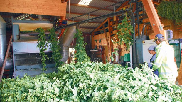 Während den drei folgenden Stunden lasse ich 1200 Hopfenranken durch die Pflückmaschine. Sie trennt die wertvollen Hopfendolden von Stängeln, Aufhängedraht und Blättern. In dieser Zeit spüre ich intensiv meine Bürogummi-Arme und ich habe etwas Zeit, mit zu überlegen, ob meine Arbeit als Journalistin nicht doch sehr toll ist.