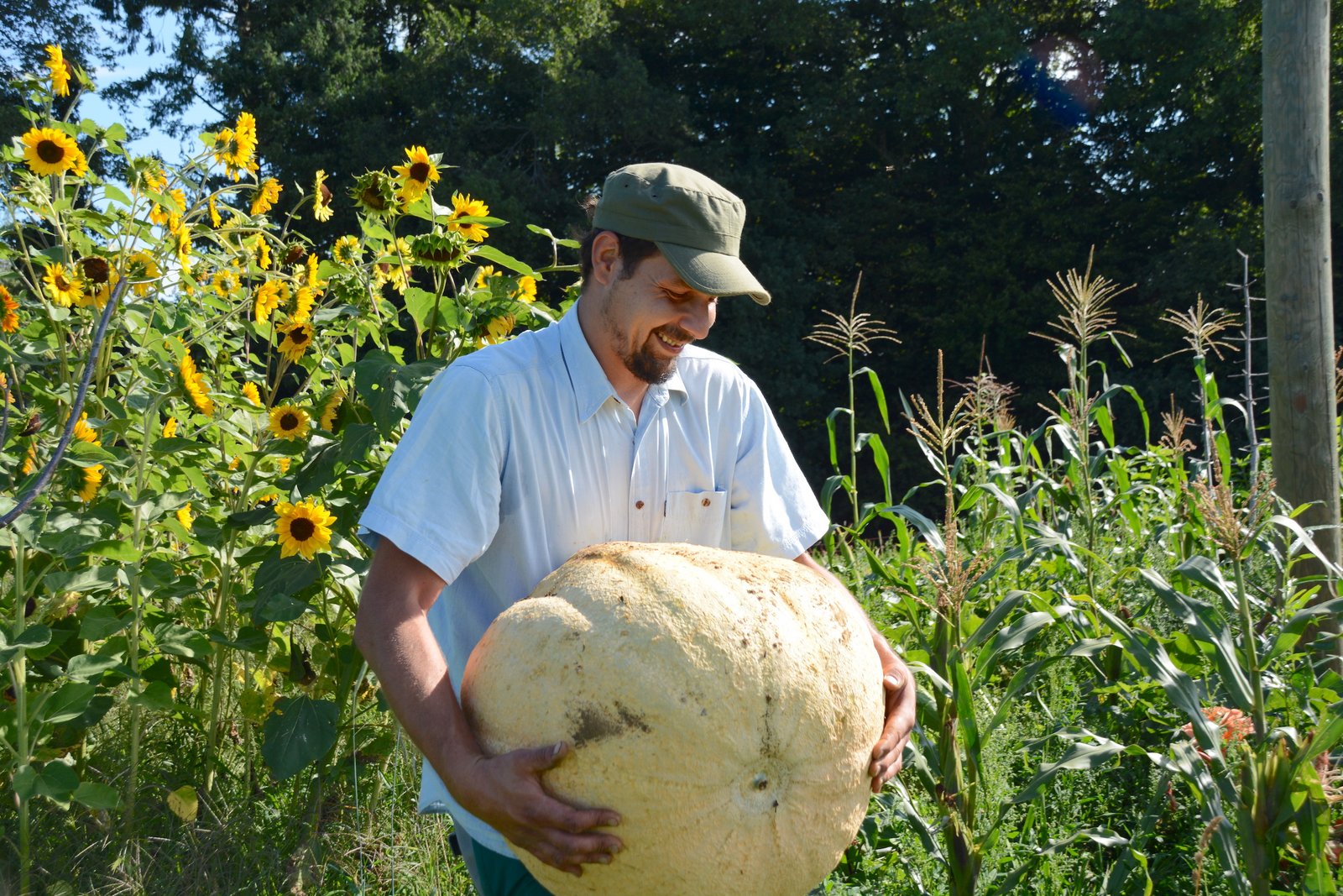 Inmitten von Mais und Sonnenblumen entdeckt Christian Bumann ein Gemüse, dessen Stängel fast violett scheinen. "Schau mal, Auberginen, und es hat sogar reife Früchte", freut er sich. Dass die dunkel glänzende Frucht schon zünftig von Schnecken angefressen wurde, scheint den 30-Jährigen nicht zu stören. In hohem Bogen fliegt die durchlöcherte Aubergine rüber zu den Topinambur-Pflanzen, wo sie dann im nächsten Jahr ihre Wurzeln schlagen soll.