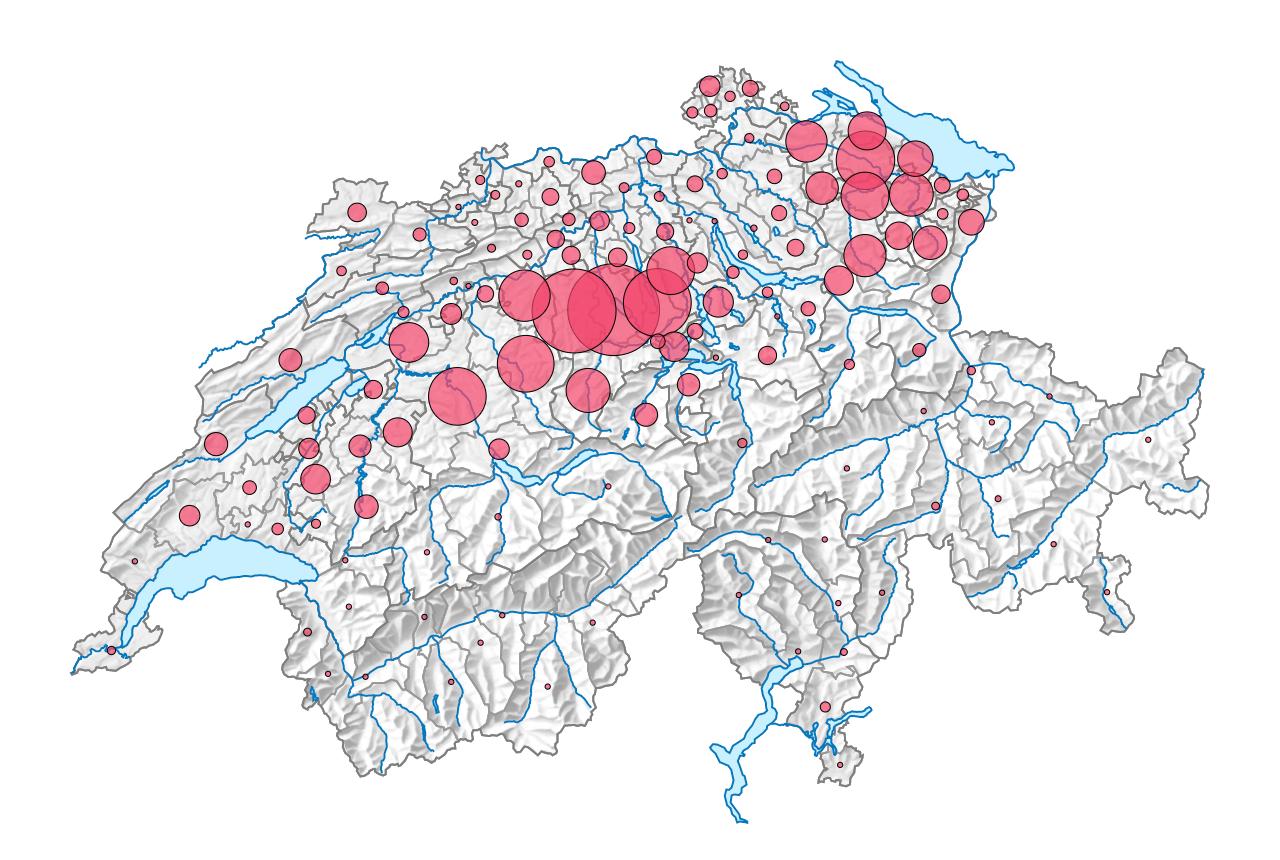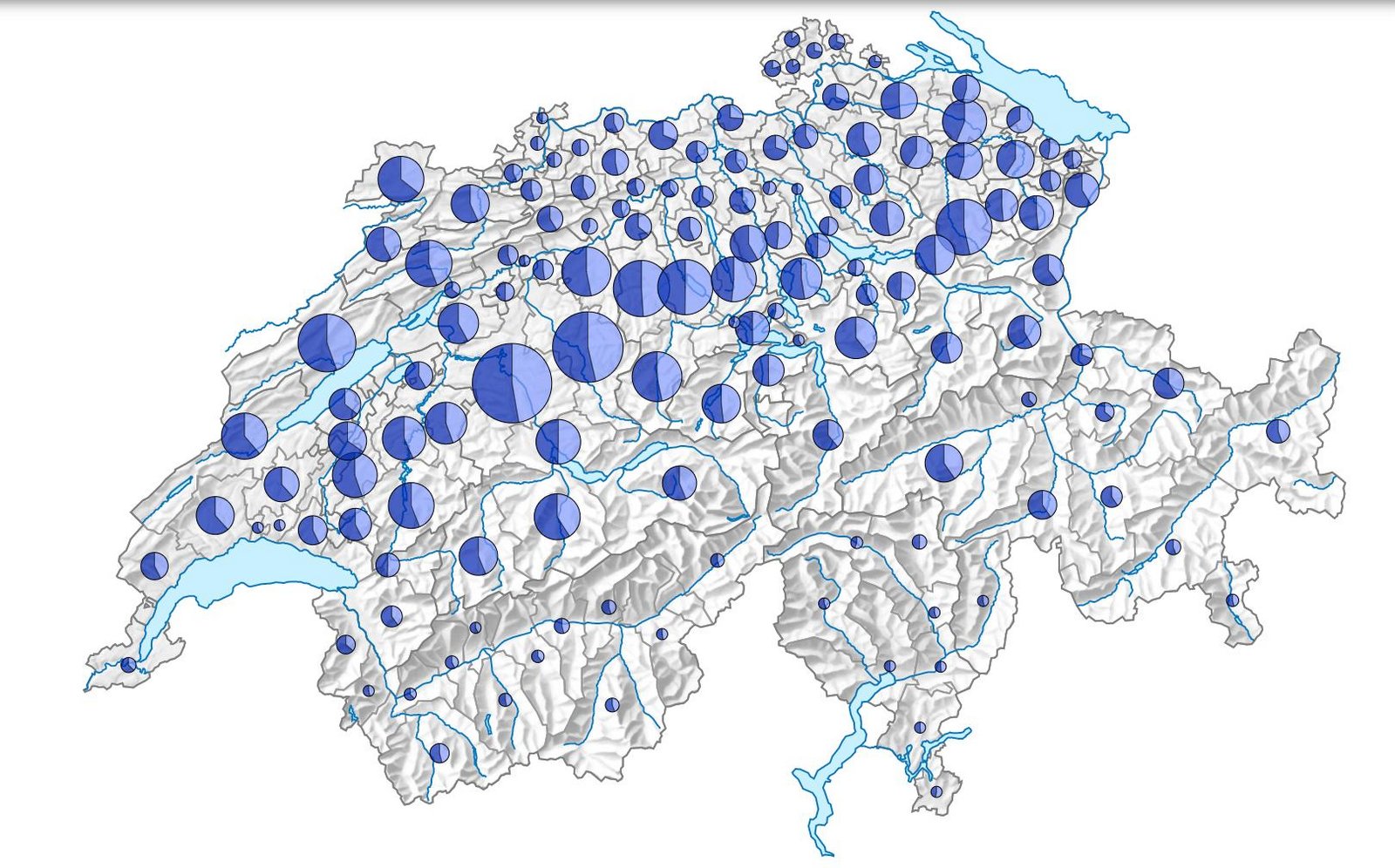 Rindvieh gab es 2019 in praktisch allen Kantonen der Schweiz. Je grösser der dargestellte Kreis, desto mehr Kühe (hellblau) oder übriges Rindvieh (dunkelblau) gibt es im jeweiligen Kanton. (Karte BFS)