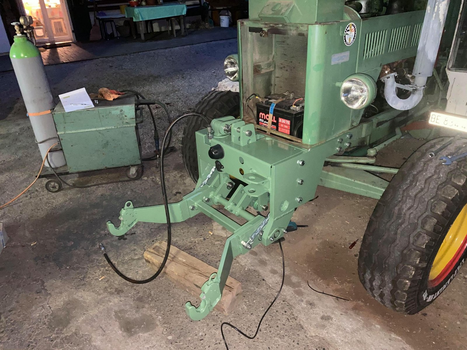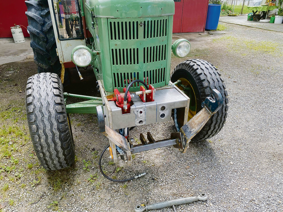 Die Fronthydraulik von Andreas Gfeller wird angesteuert über ein DW-Steuerventil mit Schwimmstellung und besitzt Zusatzanschlüsse via Magnetventil. Um die Fronthydraulik im Bührer-Grün lackieren zu können, wurde das Metall zuvor mit dem Sandstrahler behandelt und grundiert. Der alte Bührer hat jetzt eine Hubkraft von 2,3 Tonnen an der Fronthydraulik. Daran kann Gfeller jetzt auch ein Frontgewicht befestigen. Zeigen…
