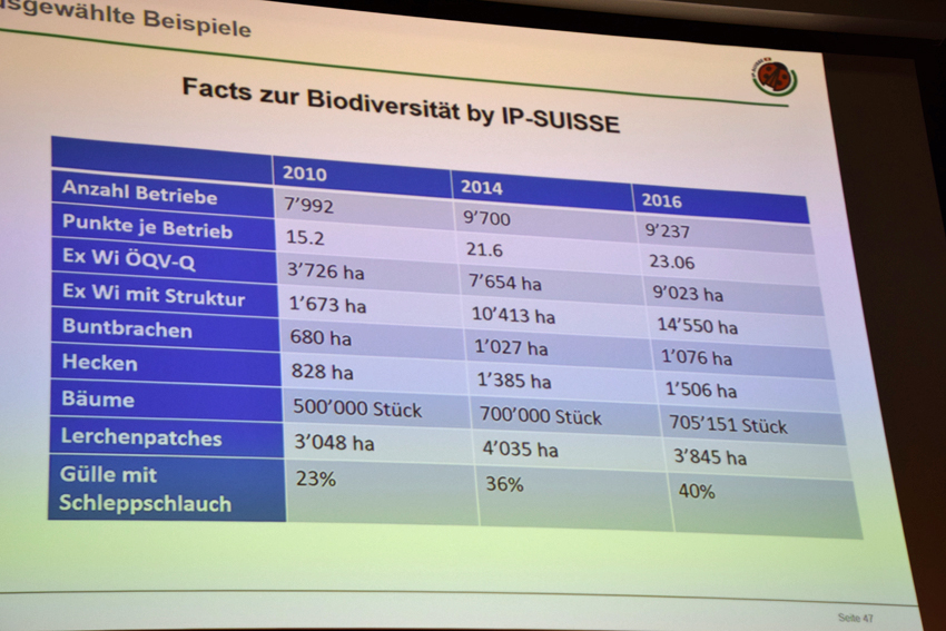 Die meisten der heute 9237 Betriebe (2010: 7992 Betriebe) übertreffen dieses Limit aber freiwillig deutlich. Laut Rothen war man 2016 im Schnitt bei über 23 Punkten (siehe auch zweite Foto oben), 2010 betrug der Schnitt noch bei bescheidenen 15,2 Punkten. Stark zugenommen haben auch weitere Biodiversitäts-und Öko-Kennzahlen: