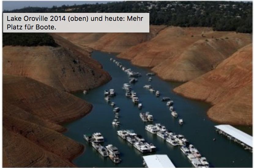 Nun hat das Newsportal Bluewin eine neue Fotoserie veröffentlicht, die hoffen lässt. Denn Anfang 2017 hat es in Kalifornien geregnet. Viel geregnet. Der Natur scheint es zu gefallen, denn die Bildvergleiche zeigen: Die Flussläufe sind wieder besser gefüllt, die Rasenflächen auf den Friedhöfen sind wieder sattgrün und auch die Kapitäne laufen mit ihren Booten nicht mehr sofort auf Grund.