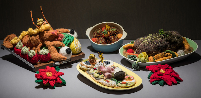 Von ihrer Kindheit in Paris und der französischen Küche beeinflusst, bildet Dominique Kähler Schweizer mit Vorliebe festliche Tafeln im Stil des 19. Jahrhunderts ab. Vom Schweinskopf auf dem Gemüsebett über Besée-Torten bis zu Hummer. Ihr Vater habe Spezialitäten in Form von Lebensmitteln gesammelt. Dazu gehörten auch Würste aller Regionen Frankreichs. Und natürlich Käse. Vom Blauschimmel-Weichkäse bis zum Hartkäse hat sie in gestrickter Form alles im Repertoire. So zum Beispiel den Urnäscher Hornkuh-Käse. Sie habe die Hersteller angefragt, ob sie ihr die Schachtel für die Masse und Bilder schicken würden zum Nachstricken. Und das hat sie dann auch getan. Dabei ist ihr auch die Botschaft wichtig: «Die Hörner der Kühe sind wichtige Fühler».