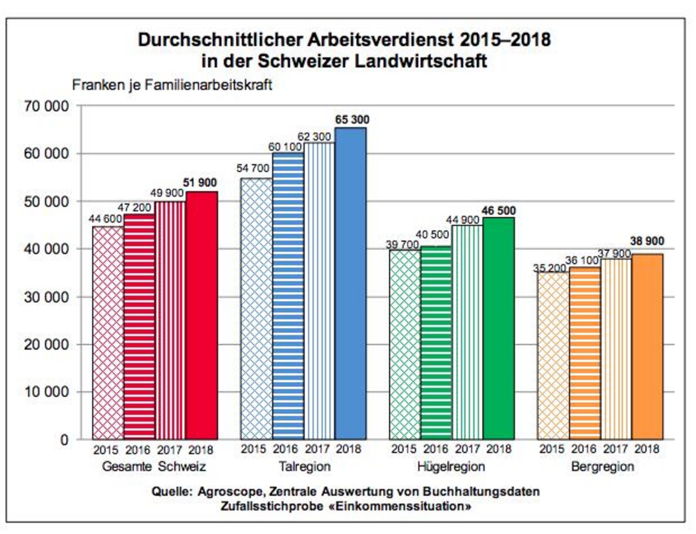 Der landwirtschaftliche Arbeitsverdienst pro Familienarbeitskraft stieg um 4,0 Prozent auf 51 900 Franken (vgl. Abbildung). Mit 65 300 Franken pro Familienarbeitskraft lag der Arbeitsverdienst am höchsten in der Talregion. In der Hügel- bzw. Bergregion fiel er mit 46 500 bzw. 38 900 Franken um 29 bzw. 40 Prozent tiefer als in der Talregion aus.