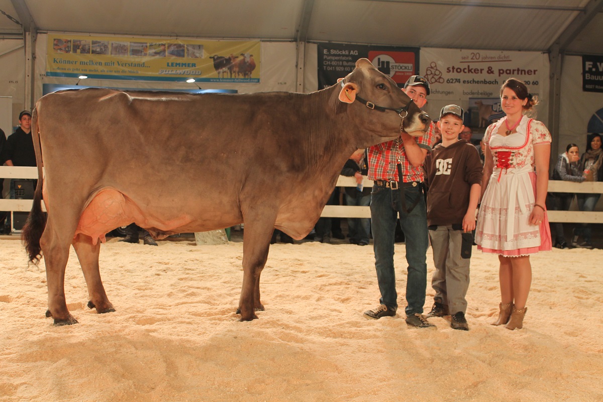Eine grosse alte Dame dominierte die Braunvieh Abteilungen: Mocambo Joya von Josef Portmann, Schüpfheim. Sie trat zwar erst in der letzten Abteilung auf die Bühne, verliess den Ring danach aber bis zur Championwahl nicht mehr. Die elfjährige Ausnahmekuh gewann die Abteilung 60‘000 kg Lebensleistung, die Schöneuterwahl der älteren Tiere und die Championwahl BV.