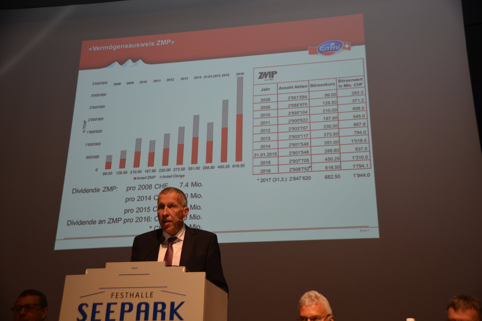Über 17 Mio Franken erhält die ZMP als Hauptaktionär von Emmi als Dividende ausgeschüttet. Vorausgesetzt die Emmi GV von nächster Woche stimmt dem Antrag für eine Erhöhung um 20 Prozent auf 5.9 Franken pro Aktie zu.