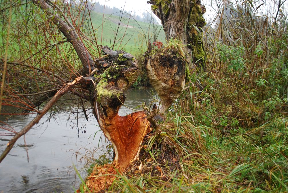 Biber sind nachtaktiv. Daher kommt es auch, dass Reinmann noch nie einen zu Gesicht bekommen hat. Aber die von ihnen hinterlassenen Spuren sind gewaltig. Kaum zehn Meter am Flussufer vergehen, an denen nicht an der einen oder anderen Stelle ein abgenagter Baum, ein Biberweg oder eine eingebrochene Höhle auf die Existenz des Nagetiers aufmerksam machen.