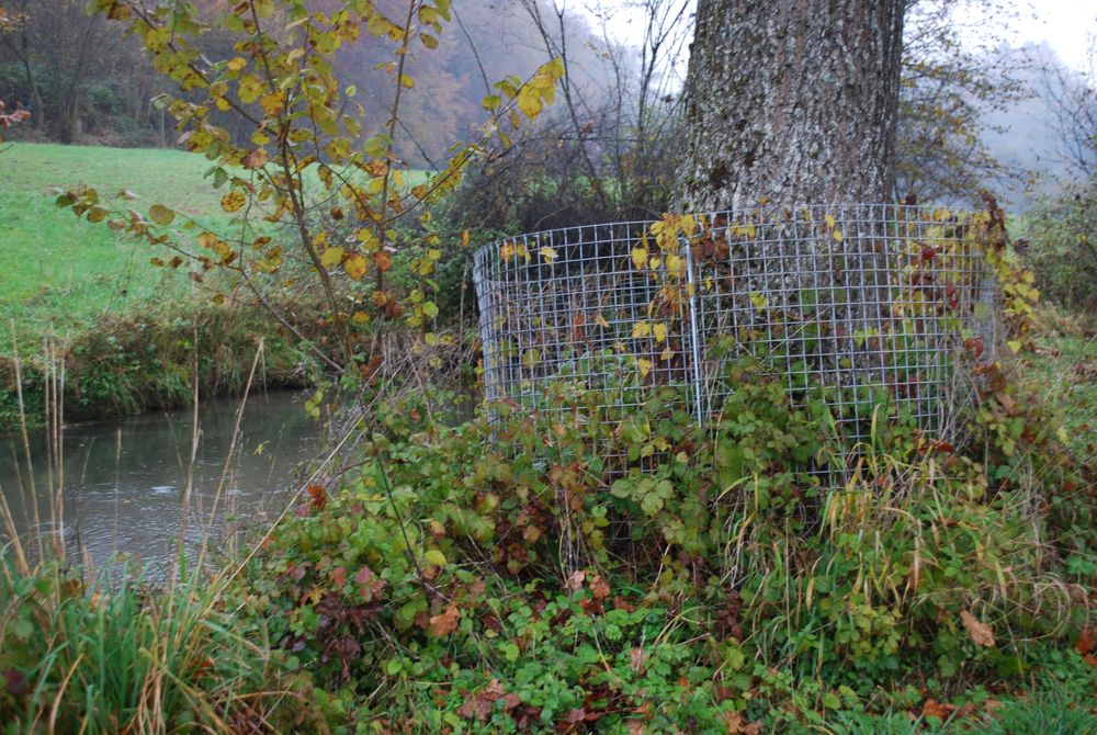 Früher hat Reinmann auf einen Zaun am Önzufer verzichtet. Die Tiere akzeptierten die natürliche Grenze. Heute setzt er seinen Zaun mit einem Meter Entfernung zum Ufer. Denn auch die Tiere würden sonst nicht davor gefeilt sein, während des Weidens auf die Höhlen zu treten. Die vom Biber gefällten Bäume, die auf der Weide landen, müssen geräumt werden. «Zum Teil lasse ich sie solange wie möglich liegen, die Biber räumen viel selbst weg», erklärt Reinmann. Um die Bäume, die er schützen will, legt er einen Gitterzaun.