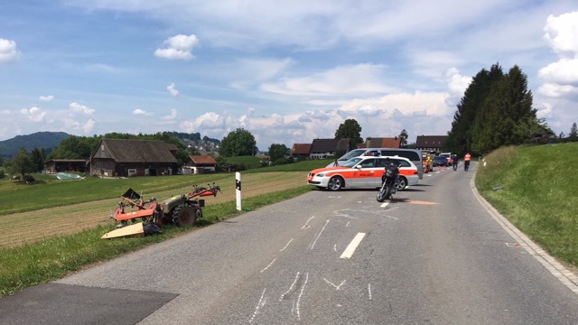 Der Zweiradlenker war kurz vor 12 Uhr auf der Hirzelstrasse in Richtung Hirzel unterwegs. Ausgangs einer leichten Rechtskurve kollidierte er mit einem Handmotormäher, der von einem 50-Jährigen über die Strasse geführt wurde, wie die Kantonspolizei mitteilte.
