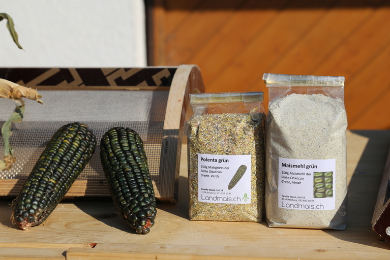 Nicht nur farblich, sondern auch geschmacklich unterscheiden sich die Sorten von den gängigen Hybriden, ist sich Roger Staub sicher: "Früher mochte ich Polenta gar nicht, heute schmeckt sie mir. Ich bevorzuge die Grüne." Er baut mittlerweile auf einer halben Hektare in Belp BE zwei Landmaissorten an, verarbeitet diese zu Mehl und Griess und vermarktet sie. Da in der Schweiz vor allem Hybridmais angebaut wird, ist der Landmaisanbau für die menschliche Ernährung eine Nische. Diese stösst auf eine steigende Nachfrage.